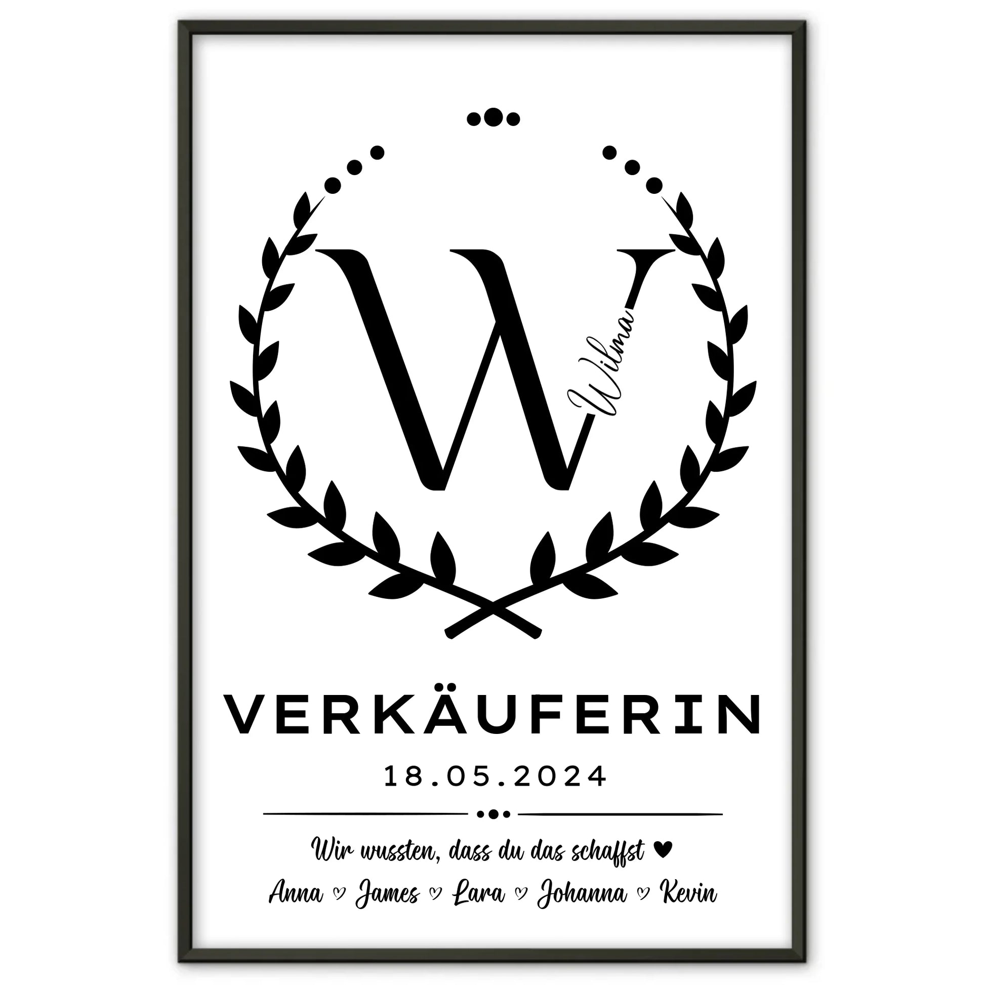 Suchst du ein einzigartiges und persönliches Ausbildungsabschluss Geschenk für eine Verkäuferin? Unser Ausbildungsabschluss Geschenk fuer Verkäuferin Poster ist genau das Richtige für dich! Dieses individuell gestaltbare Poster kannst du mit dem Initial Buchstaben, dem Datum und einem Wunschtext personalisieren, sodass es zu einem ganz besonderen Andenken wird. Ob als Abschiedsgeschenk oder als Erinnerung an den erfolgreichen Abschluss – dieses Poster ist ein tolles Geschenk zum Abschluss Ausbildung, das garantiert Freude bereitet. Mit diesem hochwertigen Poster zeigst du deine Wertschätzung und machst den Moment des Ausbildungsabschlusses unvergesslich. Verschenke jetzt ein besonderes Ausbildungsabschluss Geschenk, das die Leistungen der Verkäuferin würdigt und gleichzeitig stilvoll dekoriert.