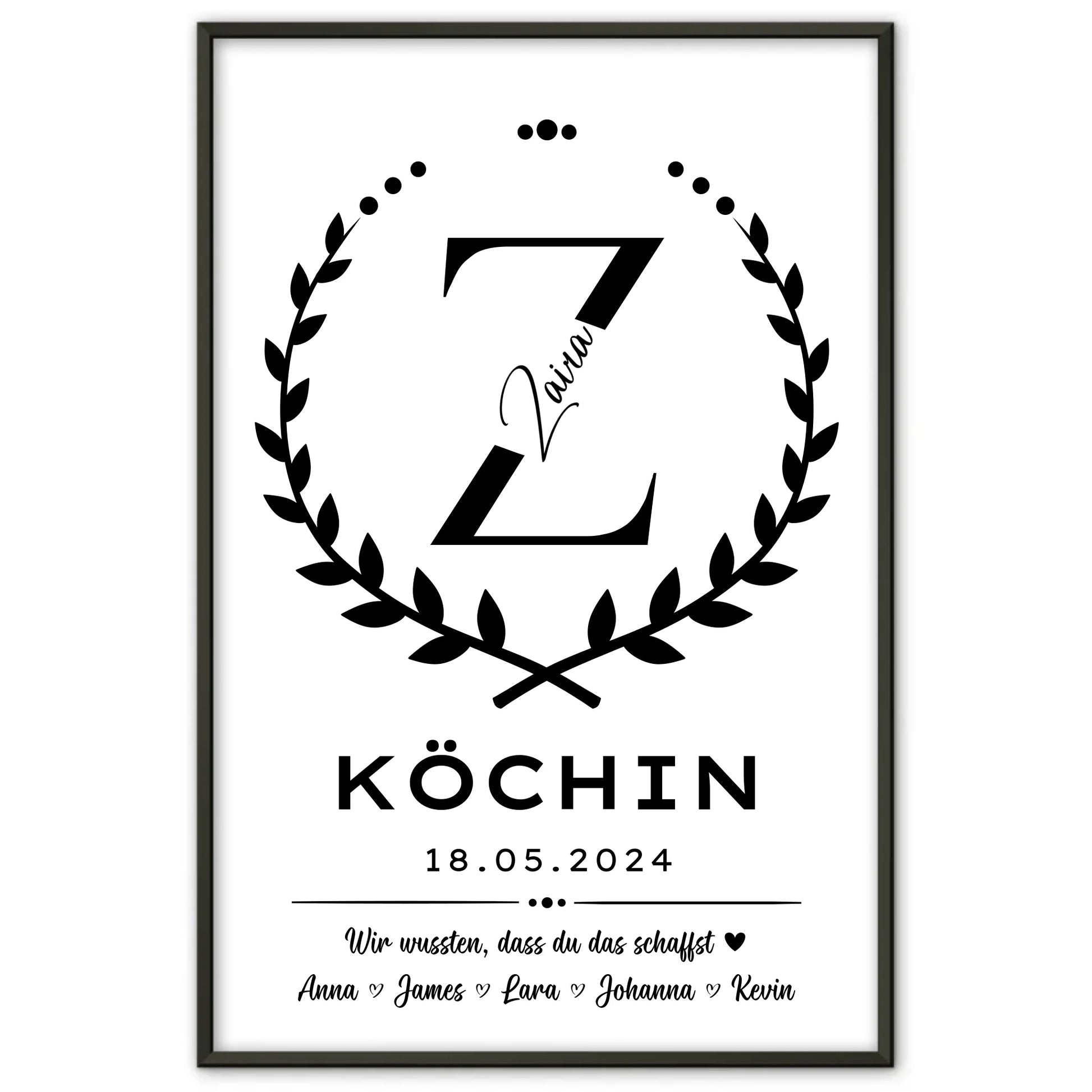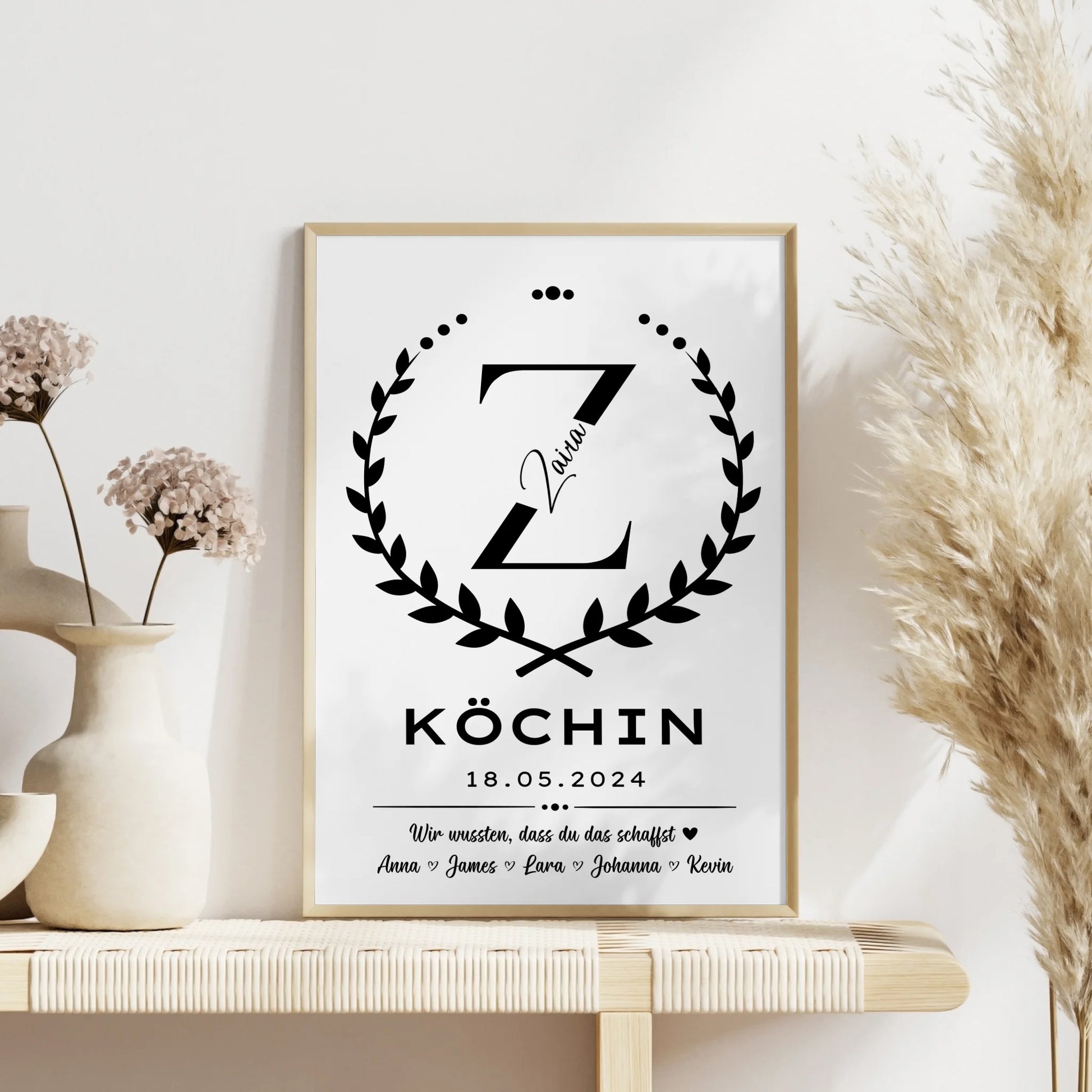 Du suchst ein einzigartiges und persönliches Ausbildungsabschluss Geschenk für eine Köchin? Unser Ausbildungsabschluss Geschenk Poster fuer Köchin ist genau das Richtige für dich! Dieses individuell gestaltbare Poster kannst du mit dem Initial Buchstaben, dem Datum und einem Wunschtext personalisieren, sodass es zu einem ganz besonderen Andenken wird. Ob als Geschenk zum Abschluss Ausbildung oder als liebevolle Erinnerung an die erfolgreiche Zeit – dieses Poster ist ideal für den Abschied und zeigt Wertschätzung auf besondere Weise. Verschenke ein hochwertiges Poster, das nicht nur optisch überzeugt, sondern auch emotional berührt. Mit unserem Ausbildungsabschluss Geschenk machst du jeder Köchin eine große Freude und schaffst ein unvergessliches Highlight zum Abschluss der Ausbildung.