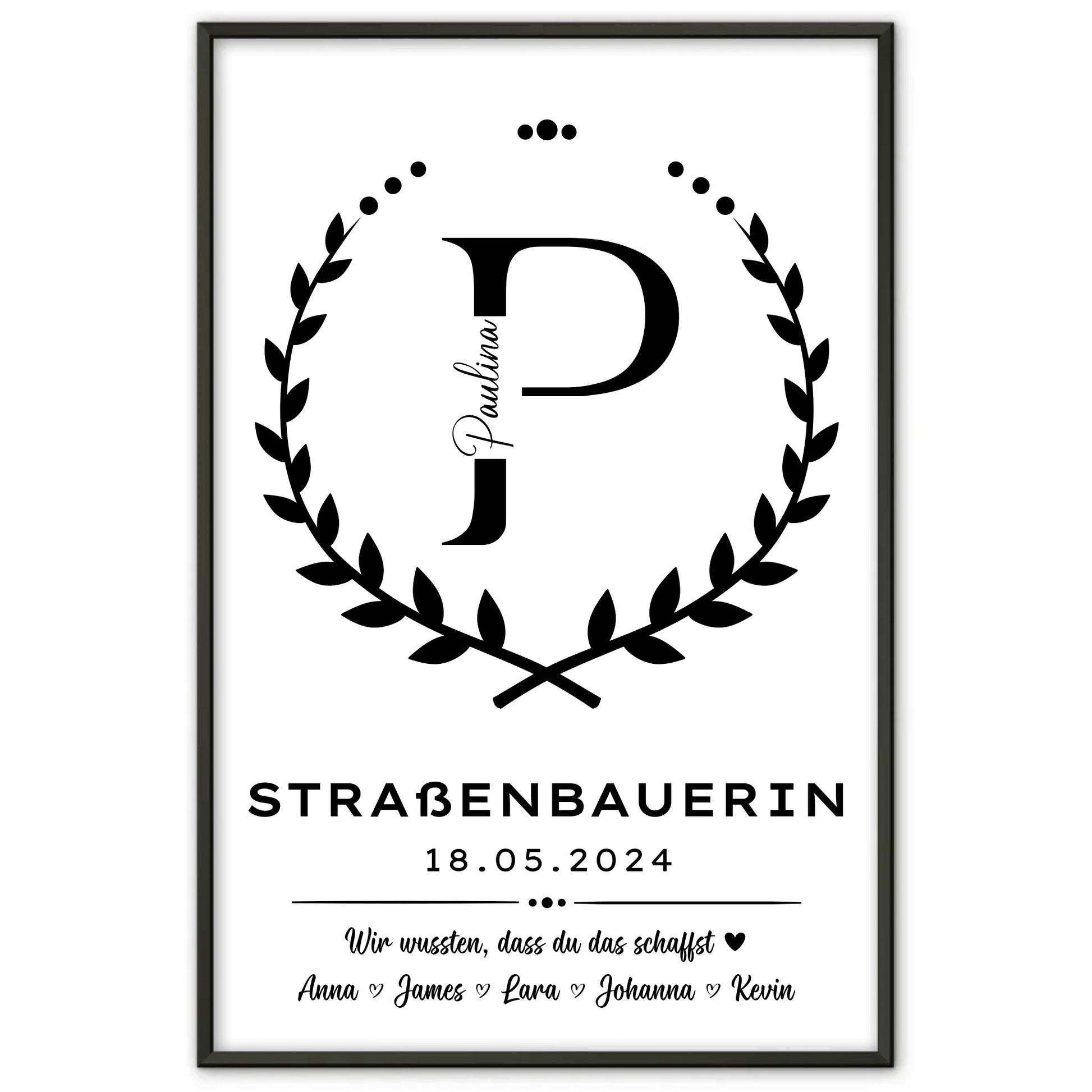 Du suchst ein einzigartiges und persönliches Ausbildungsabschluss Geschenk für eine Straßenbauerin? Unser Ausbildungsabschluss Geschenk Poster Straßenbauerin ist genau das Richtige für dich! Dieses individuell gestaltbare Poster ist das ideale Geschenk zum Abschluss Ausbildung und eignet sich besonders gut als Abschiedsgeschenk. Du kannst den Initial Buchstaben, das Datum sowie einen Wunschtext ganz nach deinen Vorstellungen personalisieren und so ein unvergessliches Andenken schaffen.