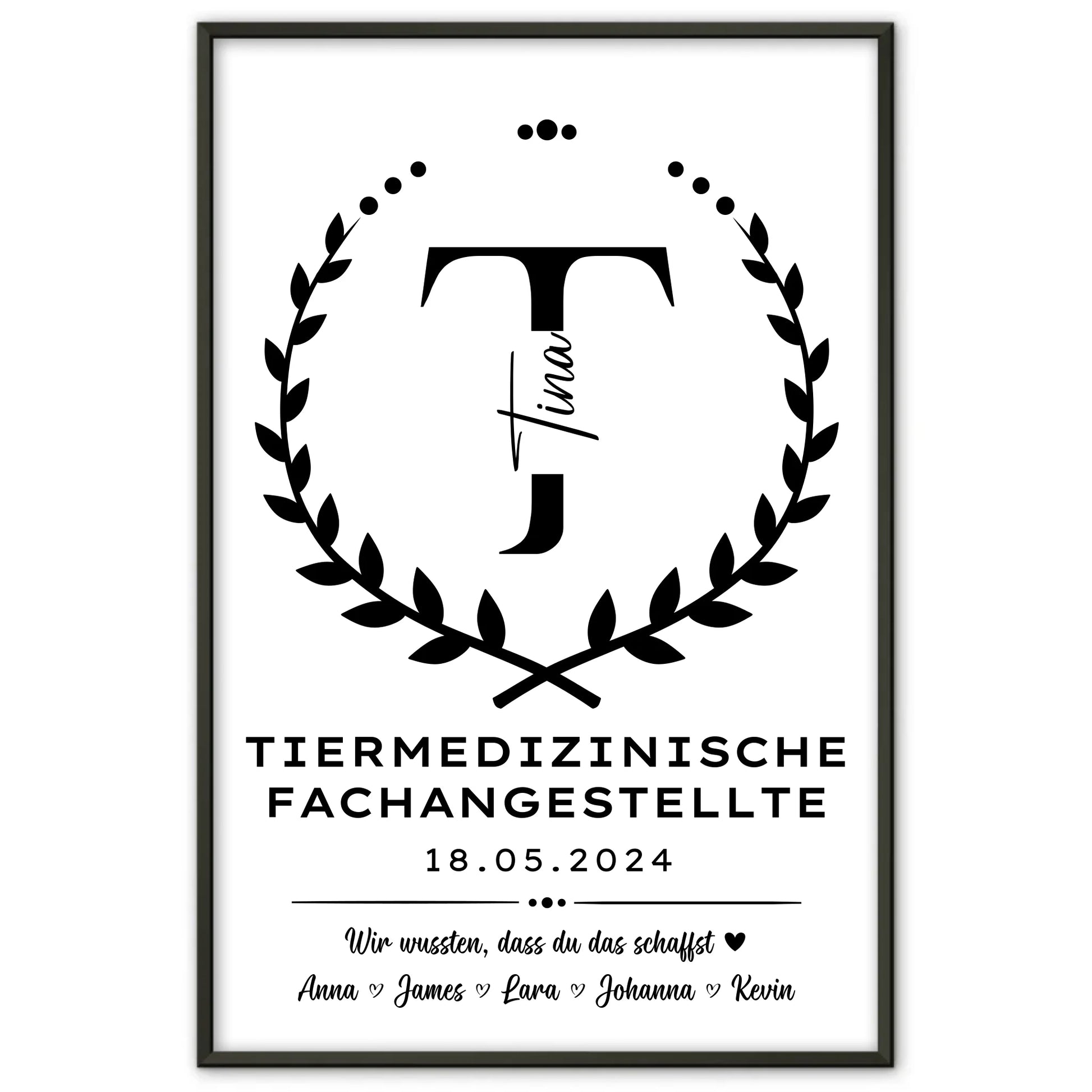 Suchst du ein einzigartiges und persönliches Ausbildungsabschluss Geschenk für eine Tiermedizinische Fachangestellte? Unser Ausbildungsabschluss Geschenk Tiermedizinische Fachangestellte Poster personalisiert ist die perfekte Wahl, um den erfolgreichen Abschluss gebührend zu feiern. Dieses individuell gestaltbare Poster kannst du mit dem Initial Buchstaben, dem Datum des Abschlusses sowie einem Wunschtext deiner Wahl personalisieren und so ein ganz besonderes Andenken schaffen. Ob als Geschenk zum Abschied oder als liebevolle Erinnerung an die Ausbildung – dieses Poster ist ideal als Geschenk Abschluss Ausbildung und zeigt deine Wertschätzung auf besondere Weise. Verschenke ein hochwertiges Poster, das speziell für Tiermedizinische Fachangestellte entworfen wurde und sich hervorragend als Geschenk zum Abschluss Ausbildung eignet. Überrasche deine Liebsten mit einem persönlichen und stilvollen Ausbildungsabschluss Geschenk, das lange in Erinnerung bleibt.