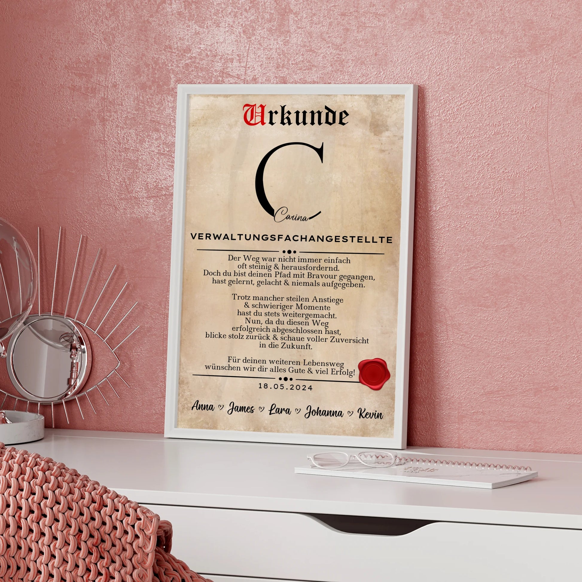 Suchst du ein einzigartiges und persönliches Ausbildungsabschluss Geschenk für eine Verwaltungsfachangestellte? Unser Ausbildungsabschluss Geschenk Verwaltungsfachangestellte Poster Urkunde personalisiert ist die perfekte Wahl, um den erfolgreichen Abschluss gebührend zu feiern. Dieses besondere Poster kannst du individuell gestalten, indem du den Initial Buchstaben, das Datum sowie einen Wunschtext hinzufügst. So wird aus dem Geschenk zum Abschluss Ausbildung ein ganz persönliches Andenken, das lange in Erinnerung bleibt. Ob als Abschiedsgeschenk oder als liebevolle Anerkennung – dieses personalisierte Poster Urkunde ist ideal geeignet, um deine Wertschätzung auszudrücken. Verschenke mit diesem Ausbildungsabschluss Geschenk nicht nur ein dekoratives Highlight, sondern auch eine bleibende Erinnerung an einen wichtigen Meilenstein im Leben der Verwaltungsfachangestellten. Überrasche mit einem individuellen Geschenk Abschluss Ausbildung, das durch seine persönliche Note besticht und jeden Raum verschönert.