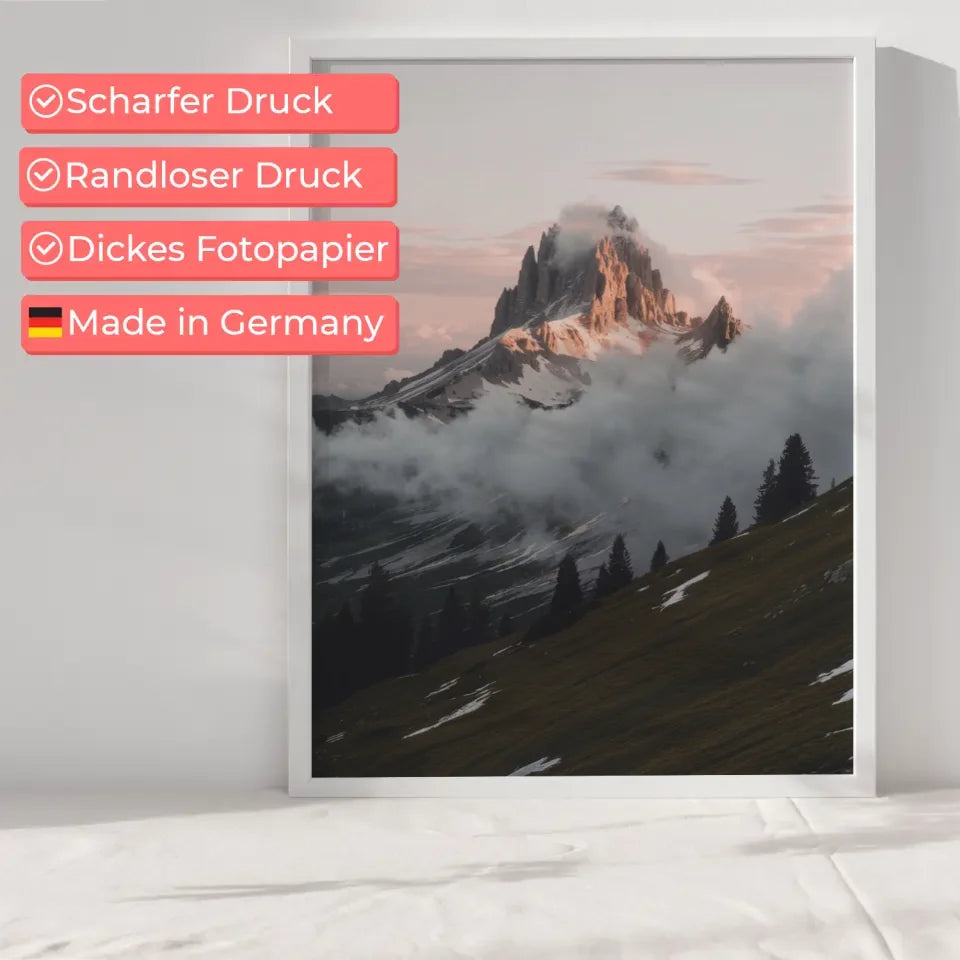 Entdecken Sie unser beeindruckendes Poster Berglandschaft Dolomiten Dämmerung mit schneebedecktem Gipfel, das Ihre Wände in ein Kunstwerk verwandelt. Dieses einzigartige Poster zeigt die majestätischen Dolomiten während der faszinierenden Morgen- oder Abenddämmerung. Der teilweise schneebedeckte Gipfel erhebt sich majestätisch inmitten eines sanften Wolkenmeeres und sorgt für eine atemberaubende Sicht.