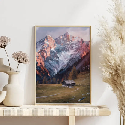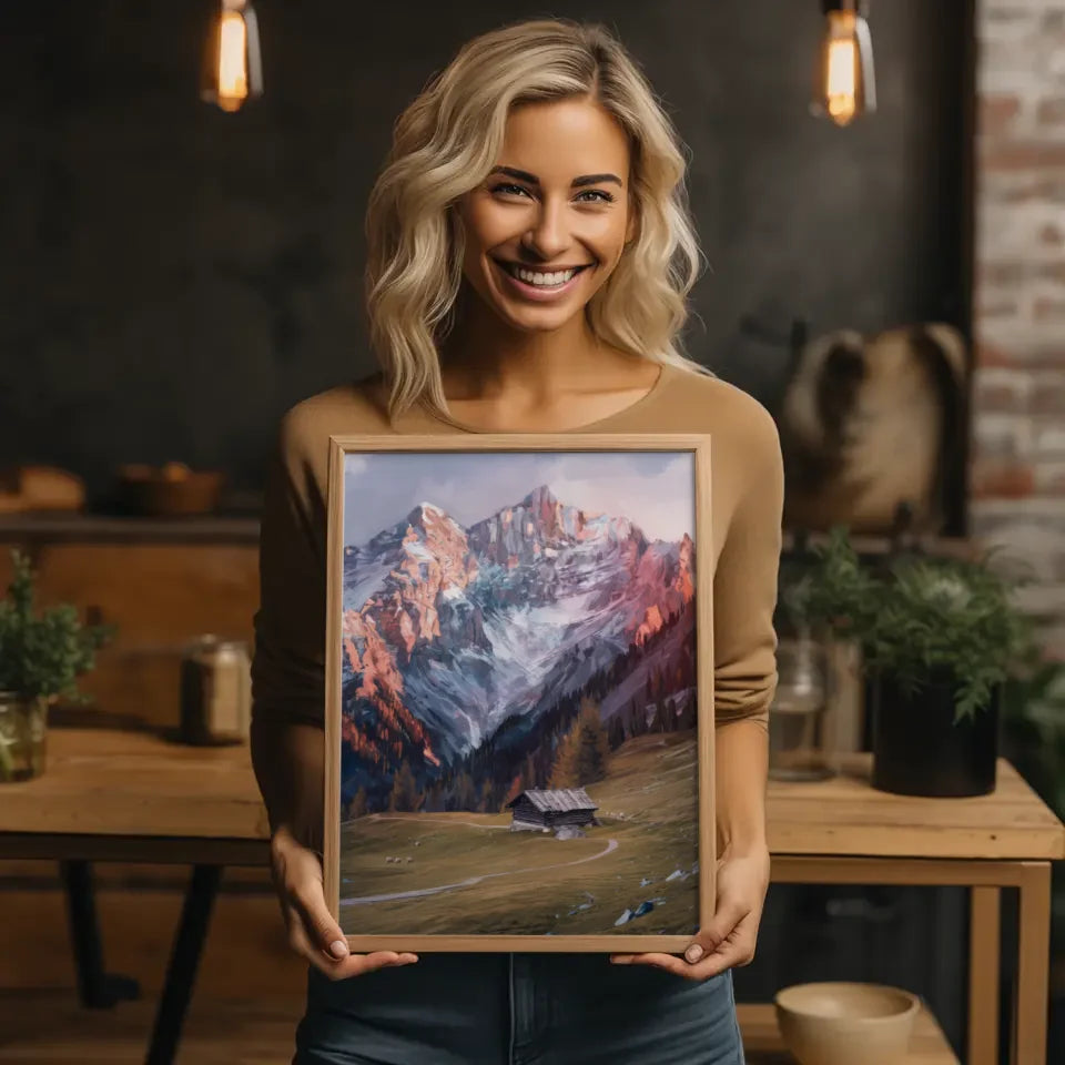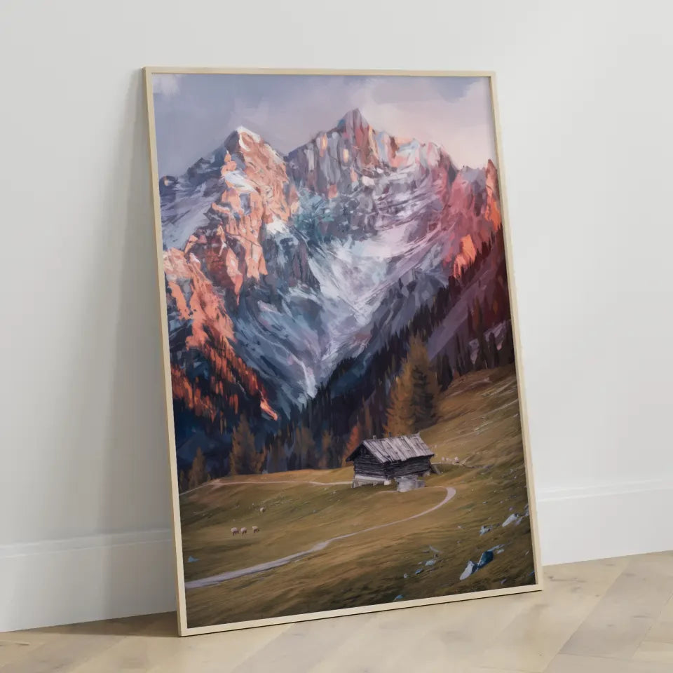Entdecken Sie unser beeindruckendes Berglandschaft Poster, das die Schönheit der Natur in Ihrem Zuhause einfängt. Mit hoch aufragenden schneebedeckten Gipfeln und majestätischen Felsformationen, die im sanften Licht der Sonne erstrahlen, bringt dieses Kunstwerk eine ergreifende Atmosphäre in jeden Raum. Im Vordergrund des Posters entfaltet sich eine ruhige Wiese, die mit ausgewählten Bäumen und einer charmanten Holzhütte geschmückt ist. Der gewundene Weg, der zur Hütte führt, lädt den Betrachter ein, in diese friedliche Szenerie einzutauchen. Auch einige grüne Tiere, die möglicherweise Schafe sind, tragen zur Idylle dieser Landschaft bei, die sowohl warm- als auch kühle Farbtöne harmonisch kombiniert. Holen Sie sich dieses besondere Kunstwerk und verwandeln Sie Ihre Wände mit unserem Berglandschaft Poster in eine inspirierende Oase der Ruhe und Erhabenheit.