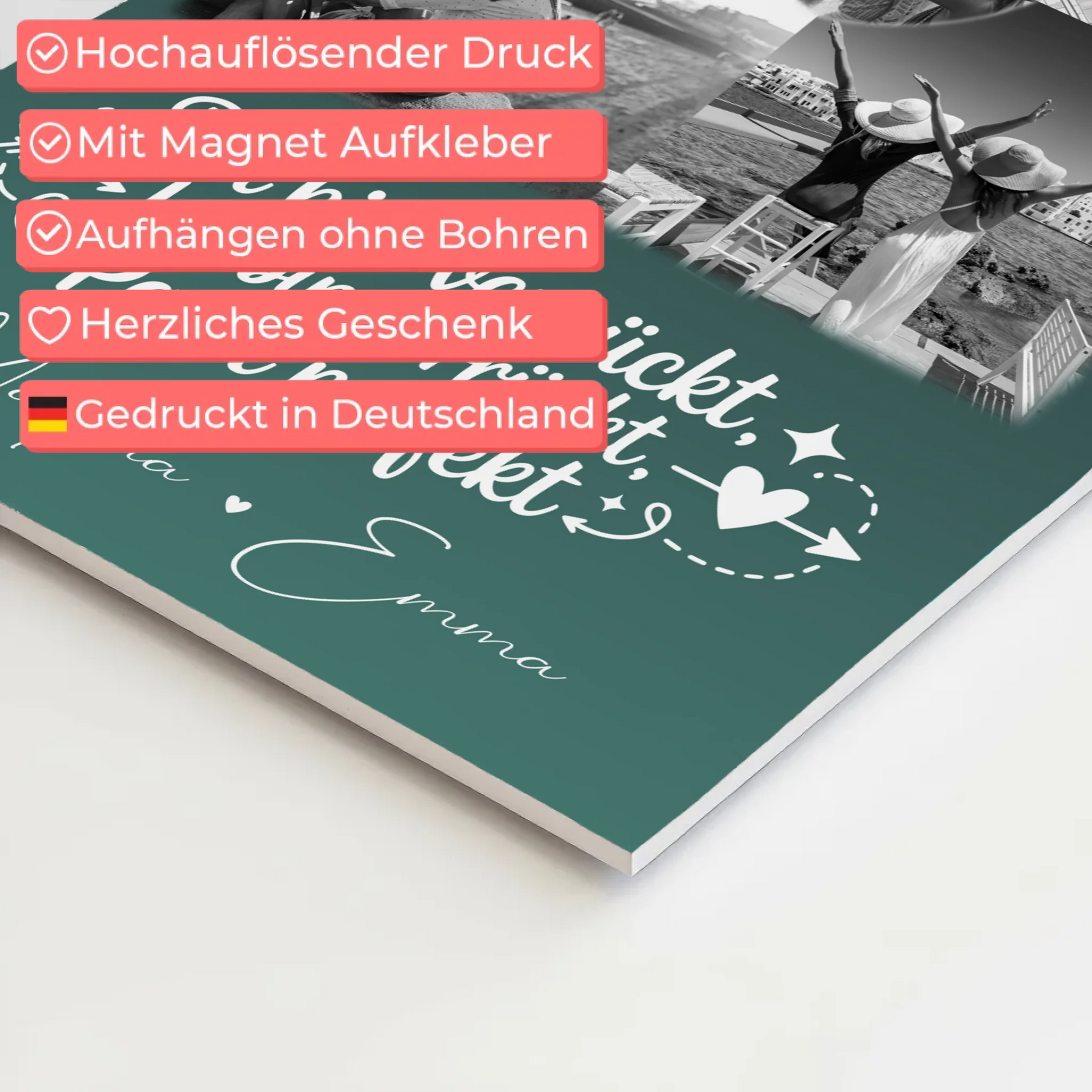 Überrasche deine beste Freundin zum Geburtstag mit einem einzigartigen und liebevoll gestalteten personalisierten Geschenk: Das Beste Freundin Fotoboard mit 3 Fotos und Herz Foto Karte Danke Mama für alles personalisiertes Geschenk. Dieses besondere Präsent ist perfekt, um eure Freundschaft zu feiern und zeigt, wie viel sie dir bedeutet. Du kannst das Design ganz individuell anpassen, indem du 4 Fotos, einen eigenen Spruch oder Wunschtext sowie eine Karte mit einem besonderen Ort und Namen hinzufügst. Das liebevolle Design trägt den inspirierenden Spruch: Danke Mama, für alles, was du tust und alles, was du bist – eine schöne Botschaft, die eure Verbundenheit unterstreicht. Dieses personalisierte Geschenk ist ideal für den Geburtstag deiner besten Freundin und sorgt garantiert für strahlende Gesichter. Zeige deiner Freundin, wie sehr du sie schätzt, und mache den Tag unvergesslich mit diesem einzigartigen, individuell gestalteten Fotoboard. Perfekt für alle, die persönliche und kreative Geschenke lieben, die Emotionen wecken und lange in Erinnerung bleiben.