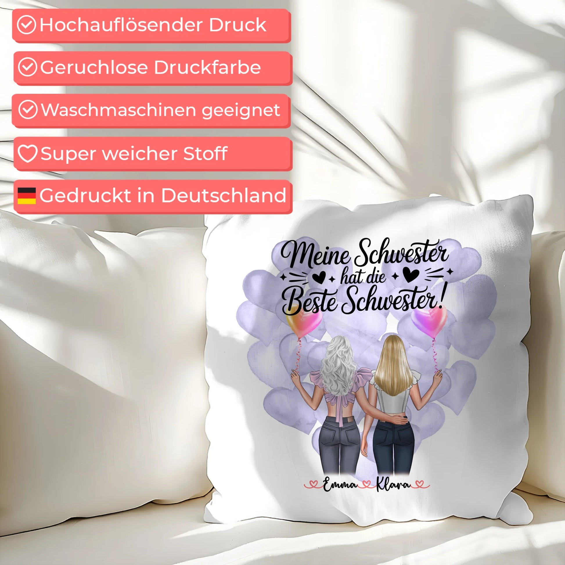 Überrasche deine Schwester mit diesem liebevoll gestalteten personalisierten Kissen, perfekt zum Geburtstag und als bleibende Erinnerung; auf dem Design steht der schöne Spruch Meine Schwester hat die beste Schwester! den du bei Bedarf durch einen eigenen Wunschtext oder einen der über 100 verfügbaren Sprüche ersetzen kannst.