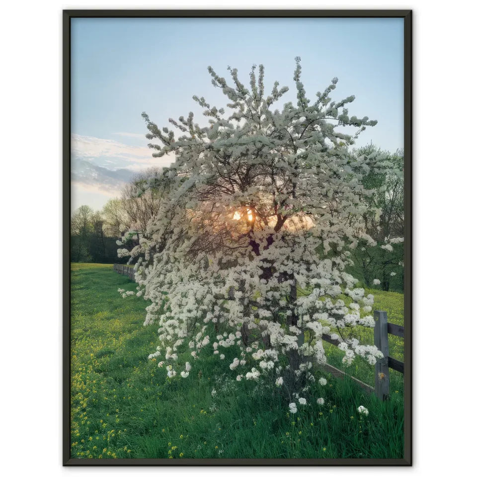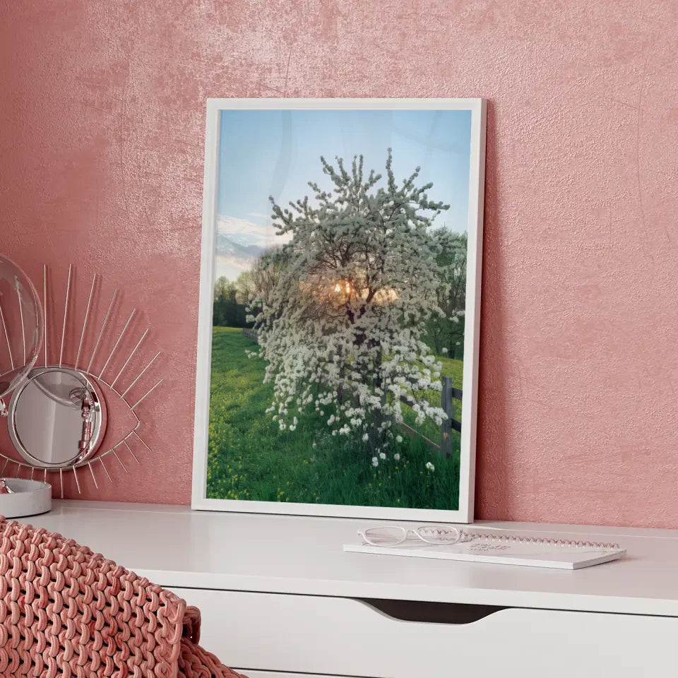 Blühender Baum Poster mit Wiese und Sonnenuntergang für Ihre Wanddeko