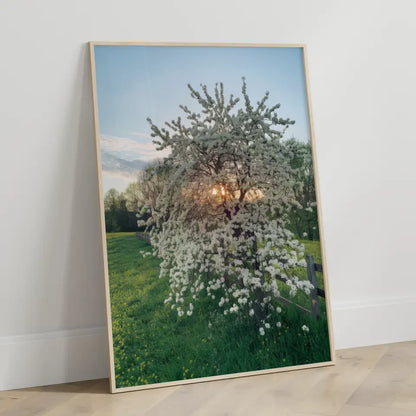 Verleihen Sie Ihrem Wohnraum eine natürliche Note mit unserem einzigartigen Blühender Baum Poster mit Wiese und Sonnenuntergang für Ihre Wanddeko. Dieses faszinierende Poster bringt die Schönheit der Natur direkt in Ihr Zuhause und sorgt für eine einladende Atmosphäre. Das beeindruckende Bild zeigt einen blühenden Baum mit weißen Blüten, der majestätisch vor einer farbenfrohen Wiese steht, auf der sich kleine gelbe Blumen entfalten. Im Hintergrund erstreckt sich ein klarer Himmel mit ein paar Wolken, während die Sonne sanft hinter dem Baum untergeht und ihr warmes Licht über die gesamte Szene wirft.