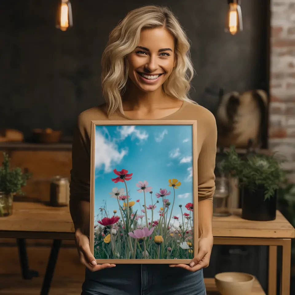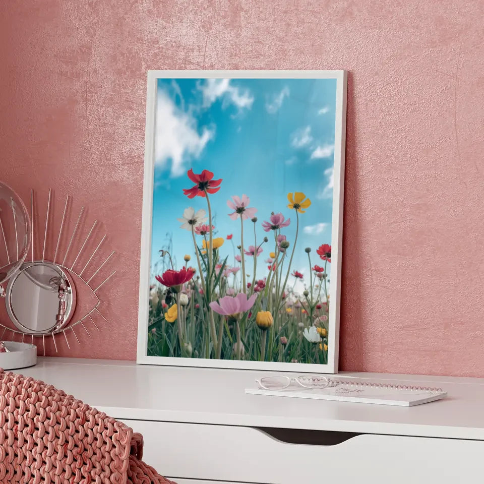 Verleihen Sie Ihrem Zuhause eine frische Note mit unserem Blumen Poster vor blauem Himmel. Diese stilvolle Wanddekoration ist perfekt für alle, die die Schönheit der Natur in ihren Wohnräumen einfangen möchten. Das Poster zeigt eine lebendige und ruhige Szene, in der farbenfrohe Blumen vor einem klaren, blauen Himmel erblühen. Die Blüten, die an Butterblumen erinnern, präsentieren sich in kräftigen Farben wie Rot, Rosa, Gelb und Weiß, während schlanke grüne Stängel Eleganz ausstrahlen.