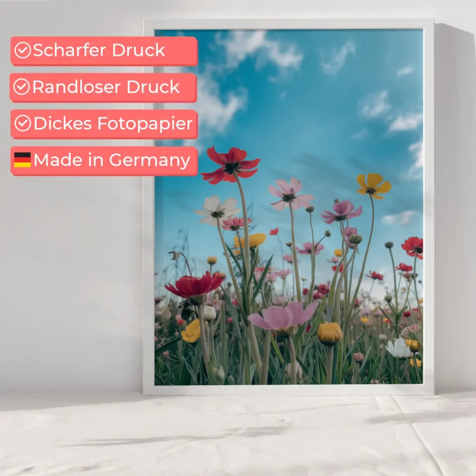 Ideal geeignet für Wohn-, Schlaf- oder Esszimmer, zieht dieses Poster alle Blicke auf sich und lässt Ihre Wände lebendig erscheinen. Bringen Sie frischen Wind in Ihre Einrichtung und setzen Sie mit unserem Blumen Poster vor blauem Himmel ein Zeichen für Frühling und Lebenslust. Entdecken Sie die Vielfalt unserer floralen Kunstbilder und finden Sie das perfekte Poster, das Ihren individuellen Stil unterstreicht.