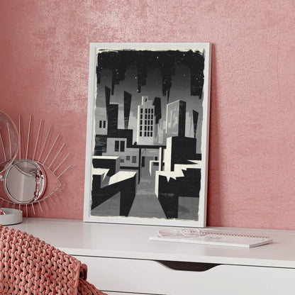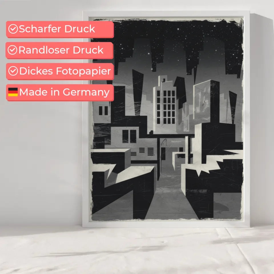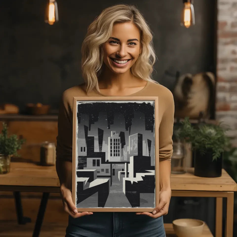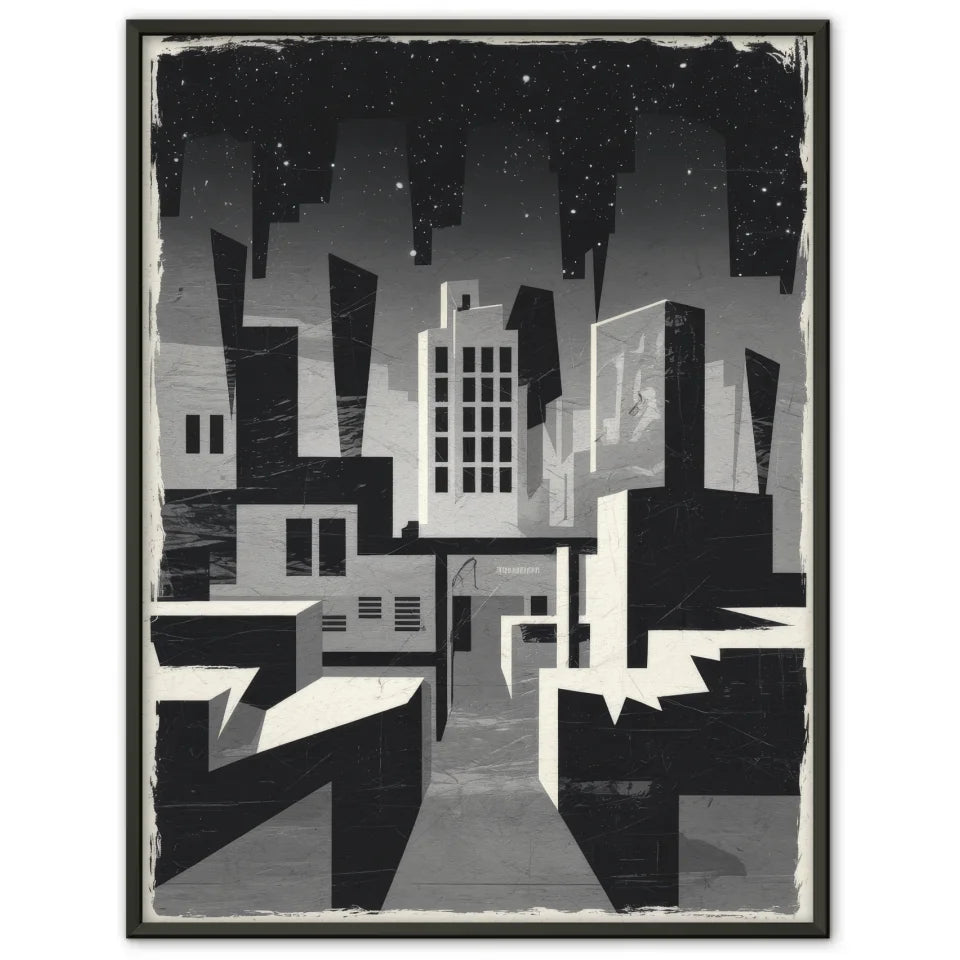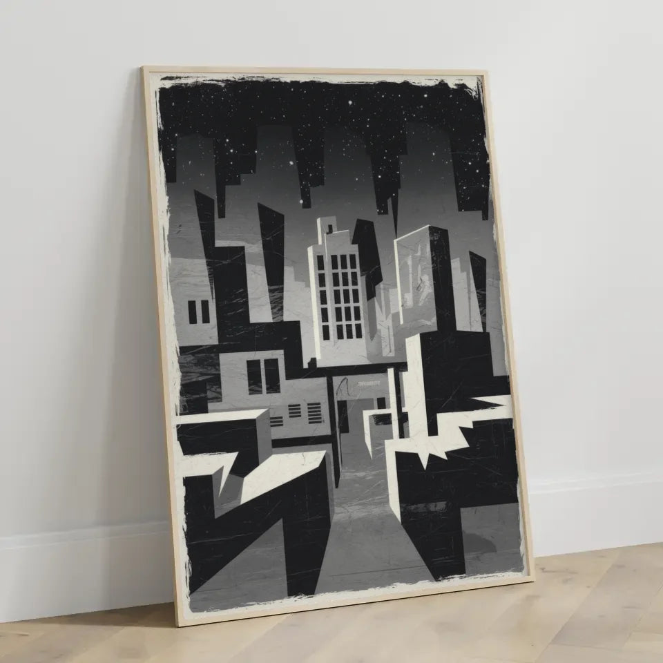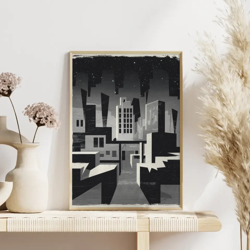 Entdecken Sie unser einzigartiges Brutalismus Poster Stadt bei Nacht in Graustufen, das Ihre WĂ€nde mit einer faszinierenden, abstrakten AtmosphĂ€re bereichert. Dieses Poster ĂŒberzeugt durch seine minimalistische Gestaltung und zeigt eine stilisierte Stadtlandschaft, die im brutalistischen Stil interpretiert wird. Die krĂ€ftigen geometrischen Formen in Graustufen erzeugen eine unheimliche Stimmung, die perfekt fĂŒr Liebhaber des Abstrakten ist.