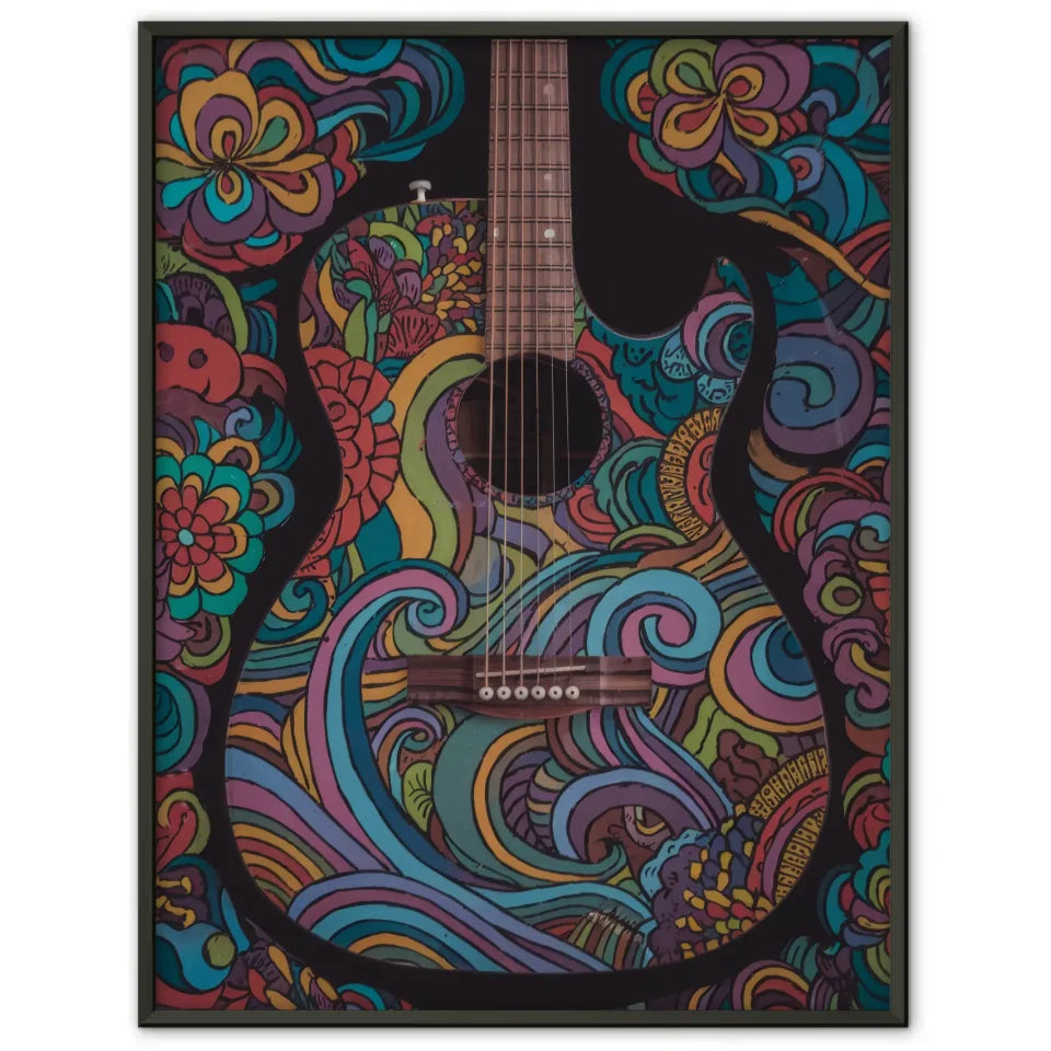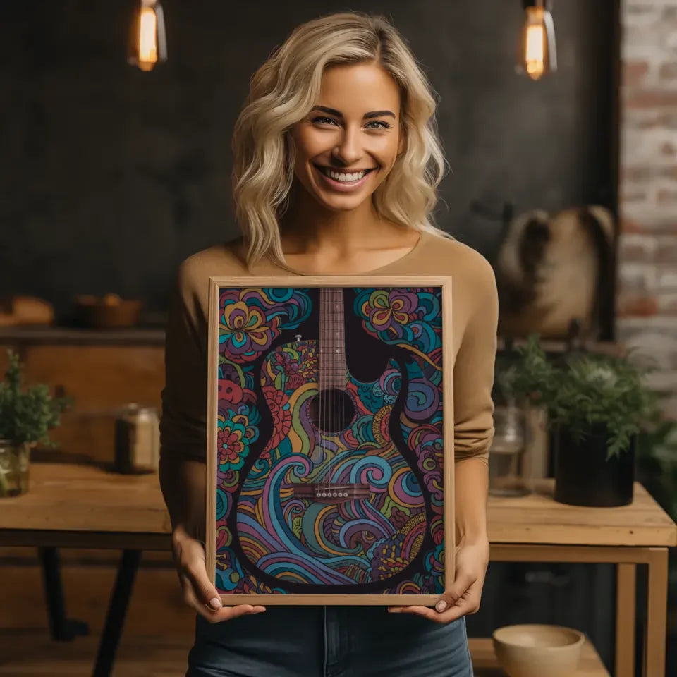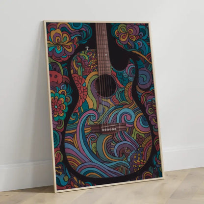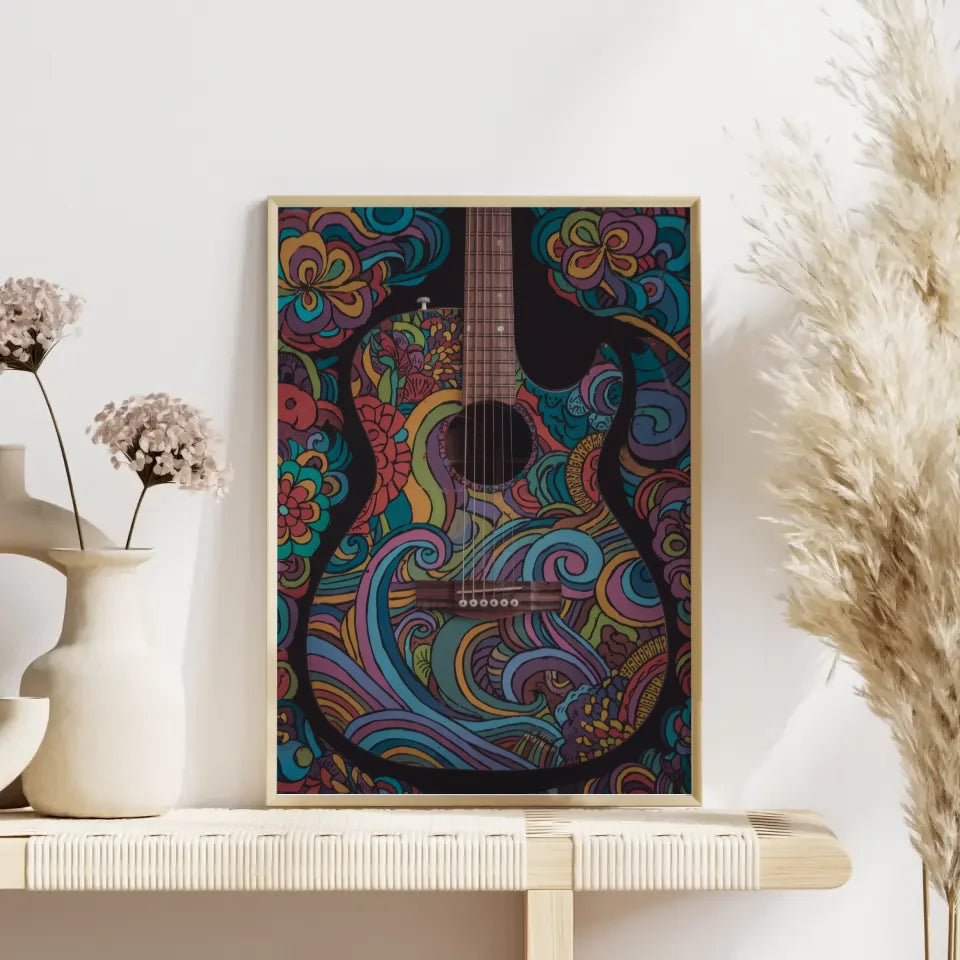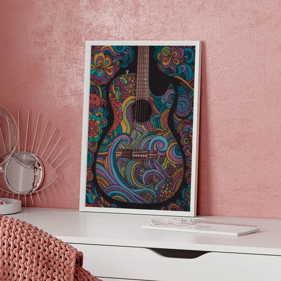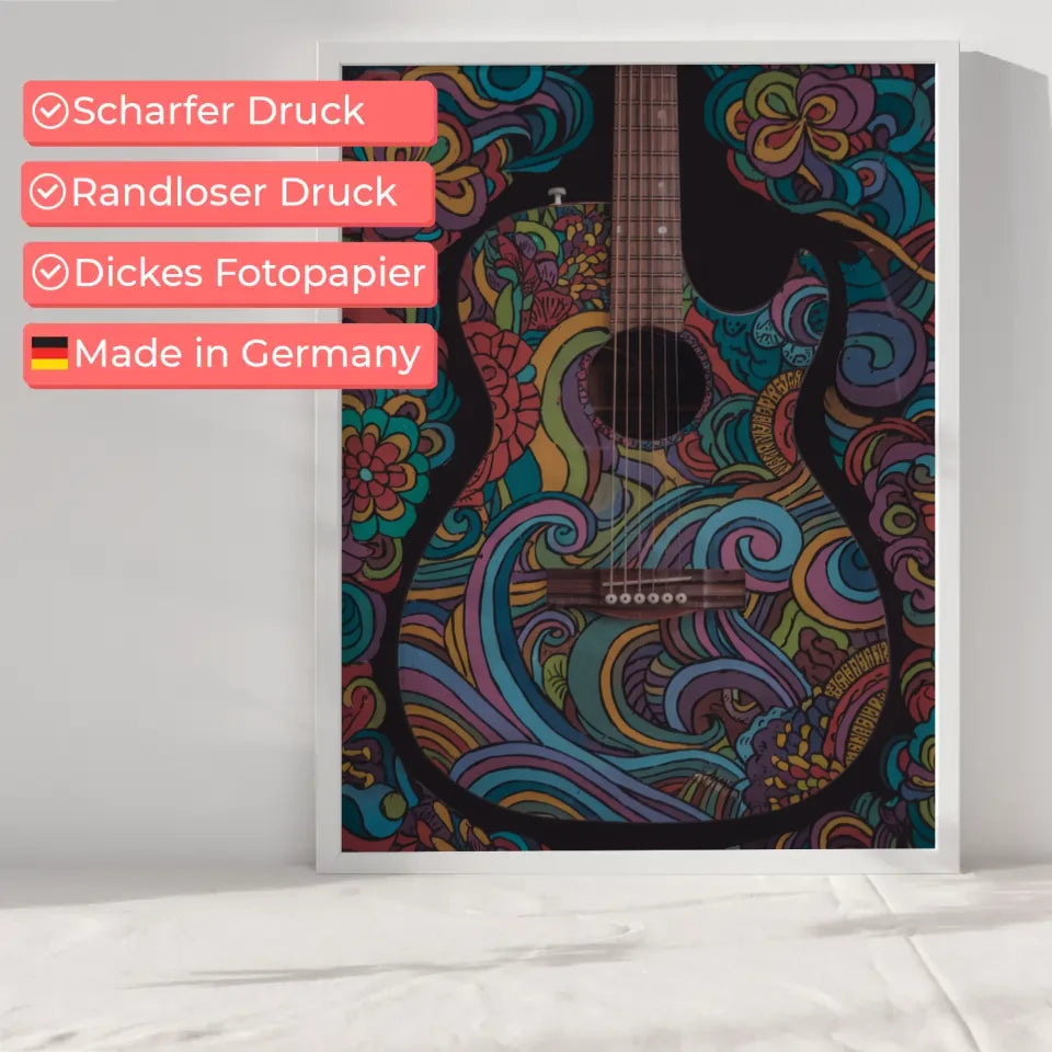Entdecken Sie unser einzigartiges Bunte Gitarre Poster mit künstlerischen Mustern, das jedem Raum eine farbenfrohe und kreative Note verleiht. Dieses Poster gehört zur Kategorie Kunst und ist perfekt für Musikliebhaber und Kunstenthusiasten. Das Bild zeigt eine lebendige Gitarre, die mit komplizierten, wirbelnden Mustern verziert ist. Die harmonische Kombination aus Blumen, Wellen und abstrakten Formen auf dem Korpus der Gitarre zieht alle Blicke auf sich und sorgt für einen echten Hingucker an jeder Wand.