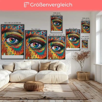 Dieses Kunst-Poster eignet sich hervorragend für kreative Räume, in denen Ideen und Emotionen frei fließen. Ob in einem Wohnraum, einem Atelier oder einem Büro – dieses bunte Poster mit dem einzigartigen Augen-Motiv wird garantiert viele Blicke auf sich ziehen und einen inspirierenden Akzent setzen.