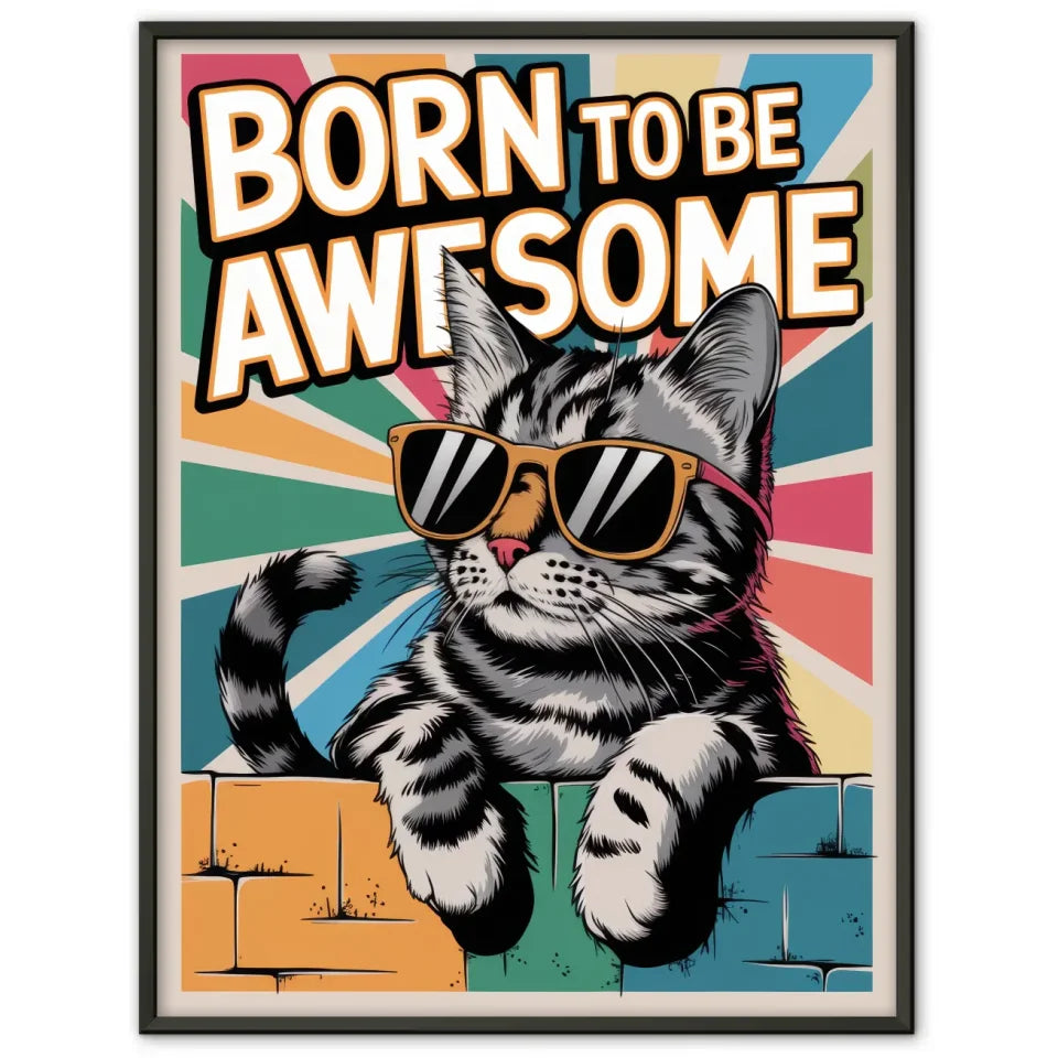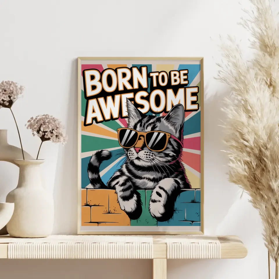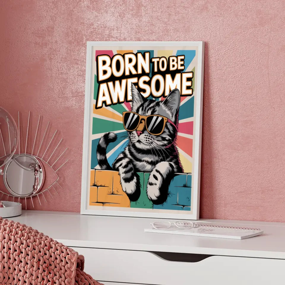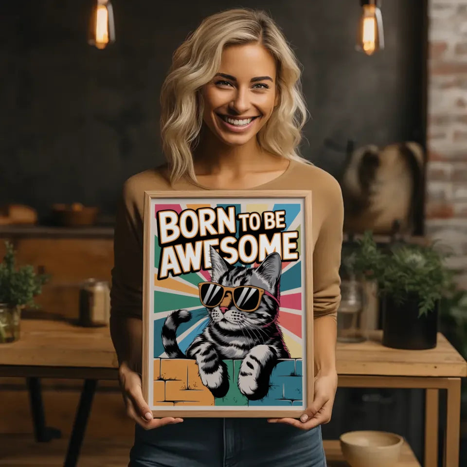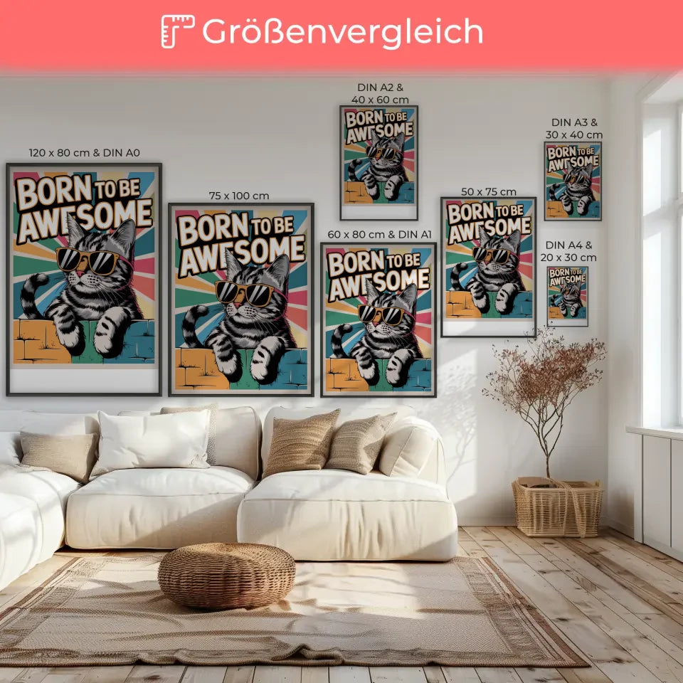 Entdecken Sie unser einzigartiges Cooles Katzen Poster mit Sonnenbrille und buntem Hintergrund, das jedem Raum einen Hauch von Stil und Persönlichkeit verleiht. Dieses Poster, das in der Kategorie Spruchbilder zu finden ist, zeigt eine lebendige Illustration einer stilvollen Katze, die selbstbewusst an einer Wand lehnt und durch ihre Sonnenbrille Coolness ausstrahlt. Der dynamische Hintergrund, bestehend aus aufregenden Farben und Formen, hebt das Gesamtbild perfekt hervor und sorgt für eine energiegeladene Atmosphäre. Die Worte 'Born to be Awesome“ sind in kräftigen, leuchtenden Farben über der Katze platziert und unterstreichen das verspielte Design. Holen Sie sich dieses atemberaubende Poster in Ihr Zuhause, um Ihrem Alltag eine positive Note zu verleihen. Ideal für Katzenliebhaber und alle, die das Leben in vollen Zügen genießen. Bestellen Sie jetzt Ihr Cooles Katzen Poster und verwandeln Sie Ihre Wände in echte Kunstwerke!
