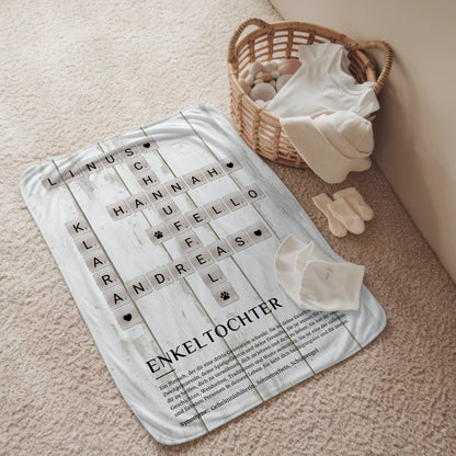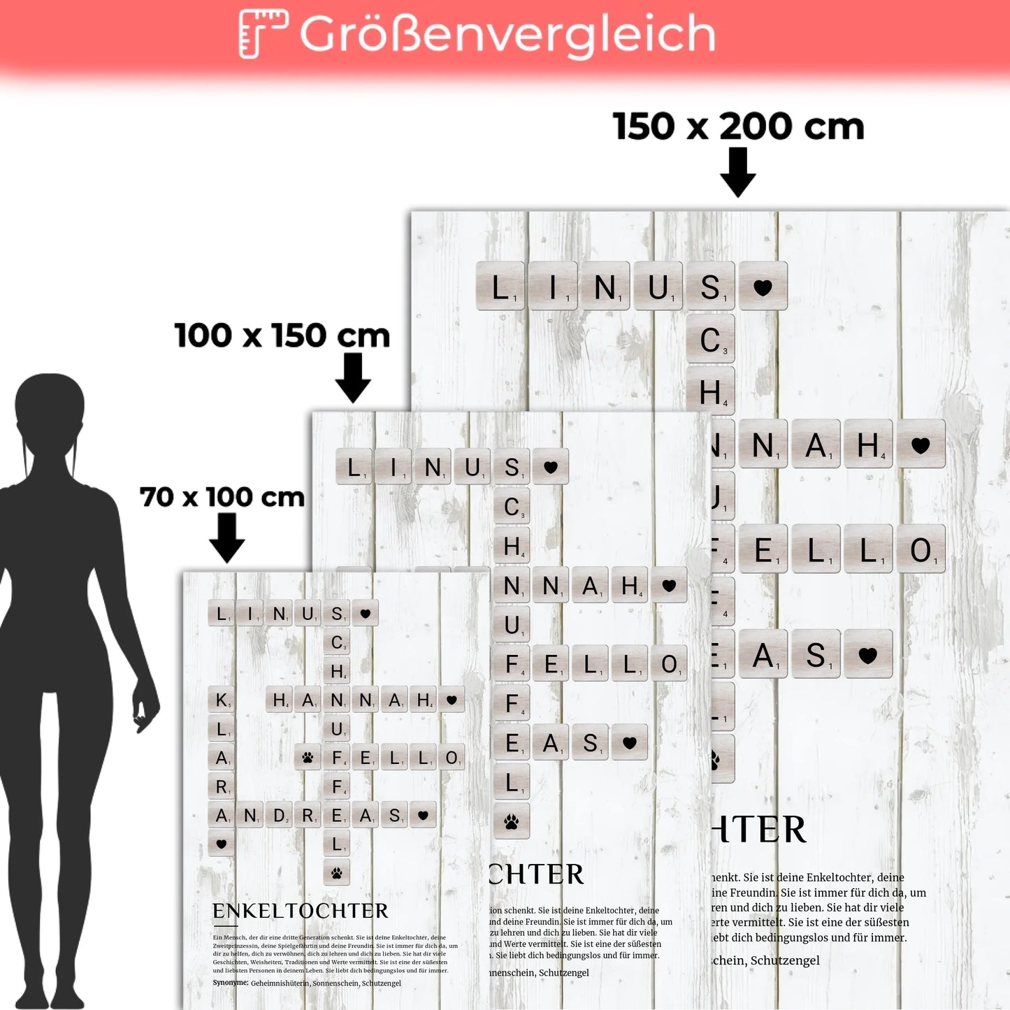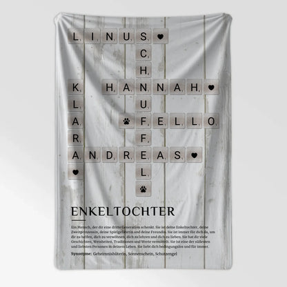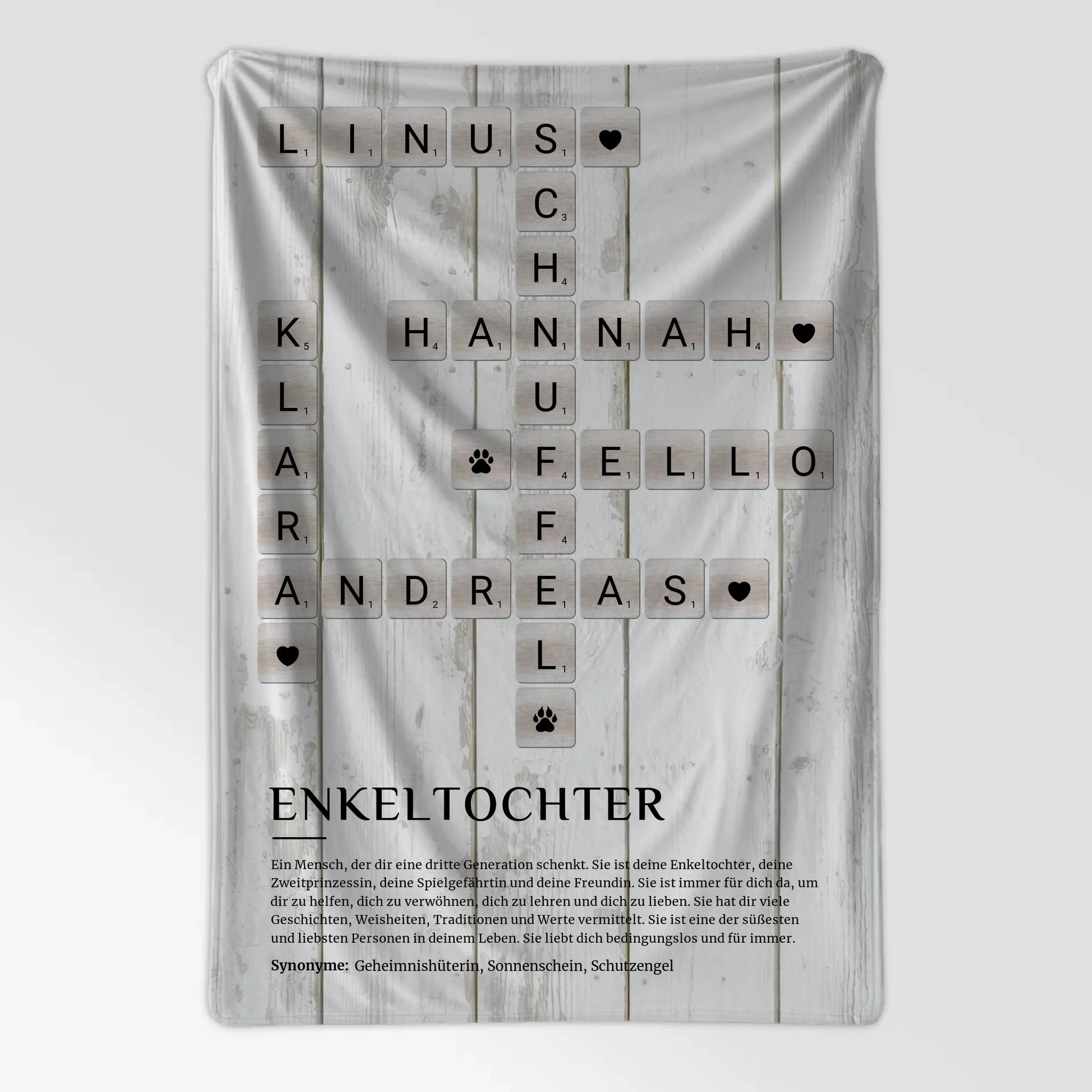 Entdecke die perfekte Geschenkidee für jeden Anlass mit unserer personalisierten Decke Mit Foto Kreuzworträtsel Definition Enkeltochter. Diese einzigartige Decke kombiniert das Beste aus persönlicher Note und kreativem Design. Du kannst nicht nur ein Foto als Hintergrundbild wählen, sondern auch Namen in das Kreuzworträtsel integrieren, um ein wirklich individuelles Geschenk zu schaffen.