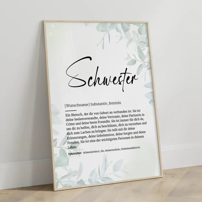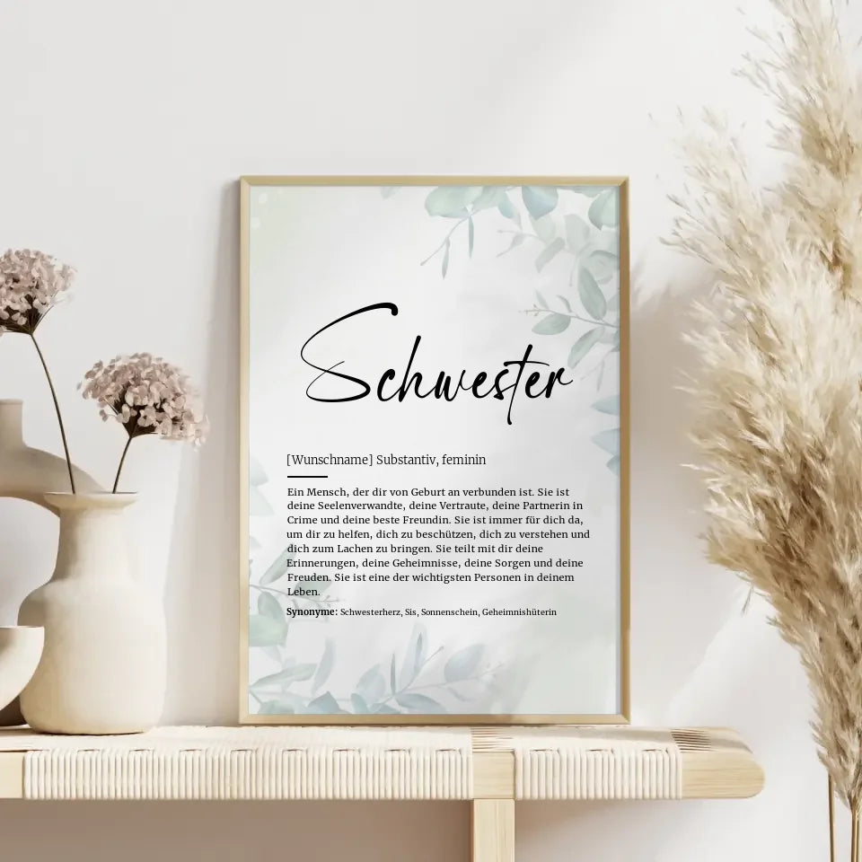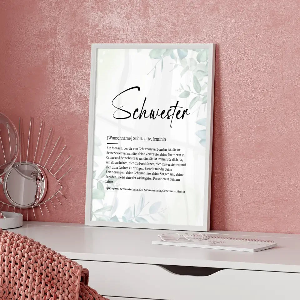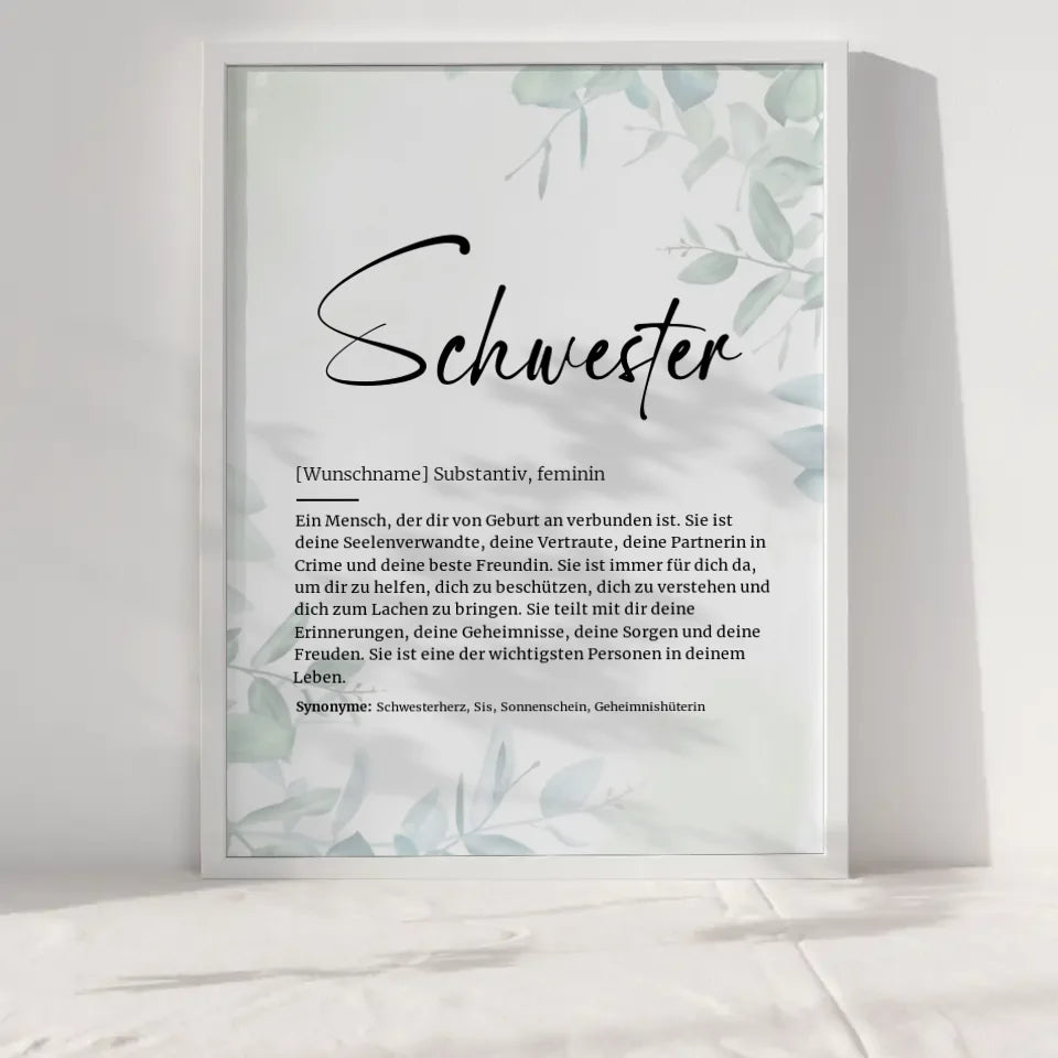 Du suchst ein tolles Geschenk? Dann ist unser Definitionsposter Definition Schwester Mit Name das perfekte personalisierbare Geschenk.