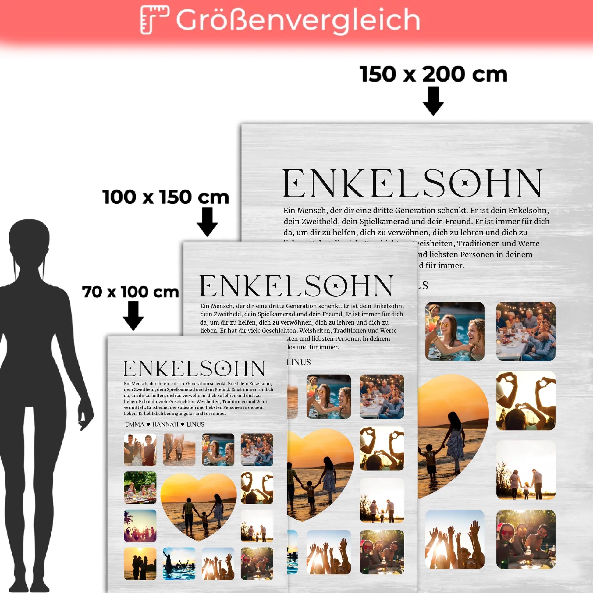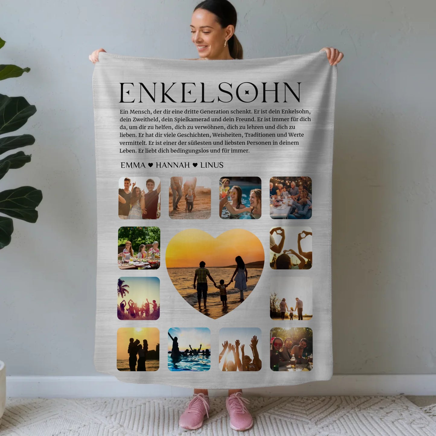 Bestelle jetzt Deine Kuscheldecke Mit Foto Fotocollage Definition Enkelsohn und überrasche deine Liebsten mit einem individuellen Geschenk, das von Herzen kommt. Eine personalisierte Kuscheldecke ist nicht nur praktisch zum Einkuscheln an kalten Tagen, sondern auch ein emotionales Erinnerungsstück voller Liebe.