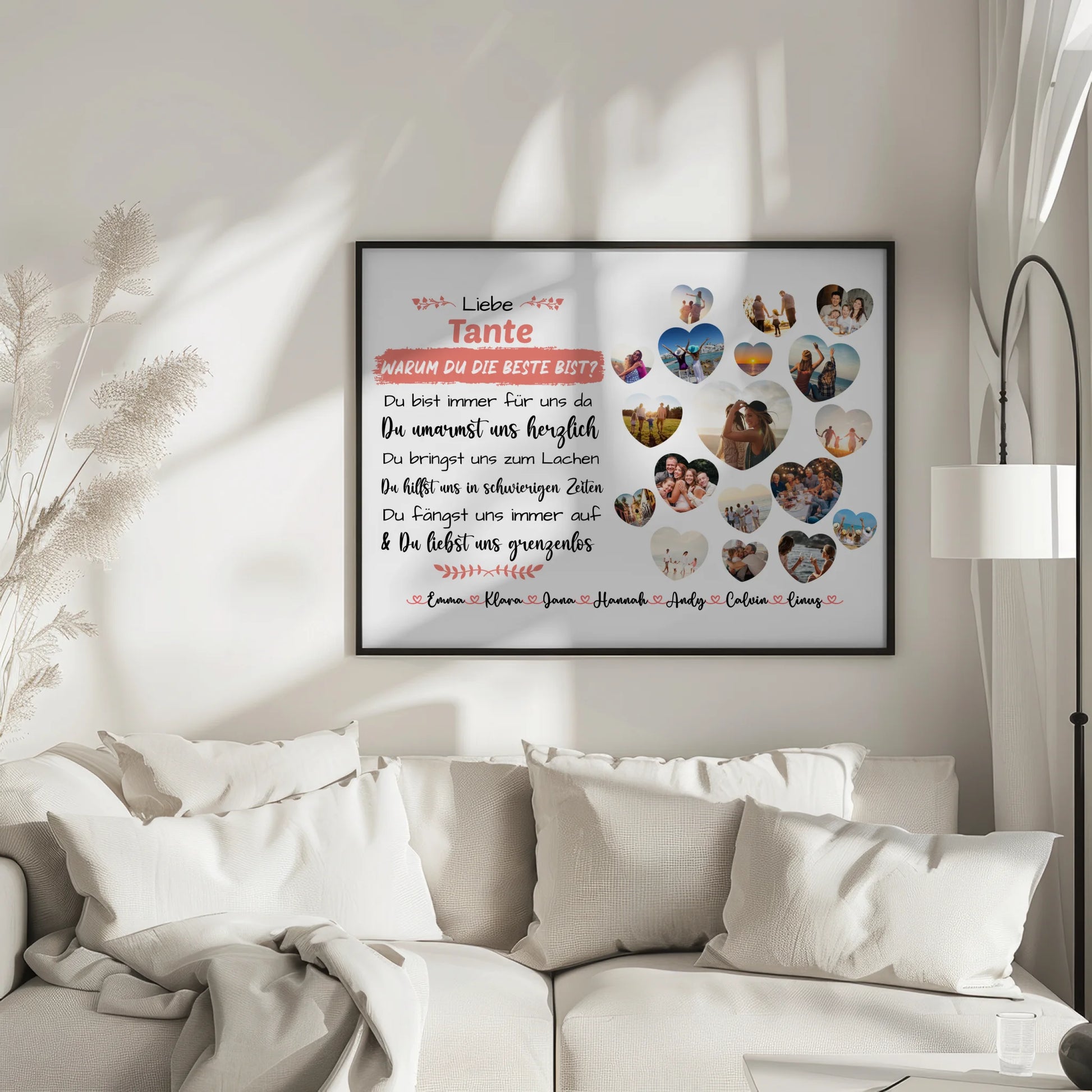 Du kannst bei diesem schönen Design 18 Fotos & 20 Namen ganz individuell personalisieren.