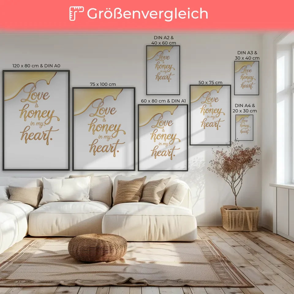 Die raffinierte Schriftart des Posters lässt die Worte förmlich erstrahlen. Die flüssigen Goldbuchstaben wirken, als wären sie kunstvoll gegossen und scheinen in einem sanften Glanz zu leuchten. Insbesondere die subtile Darstellung des Wortes 'Honig“, das in der Mitte des Designs zu fließen scheint, symbolisiert die süße Essenz von Liebe und Zuneigung. Dieses Detail macht den Poster zu einem echten Hingucker in jedem Wohn- oder Schlafzimmer.