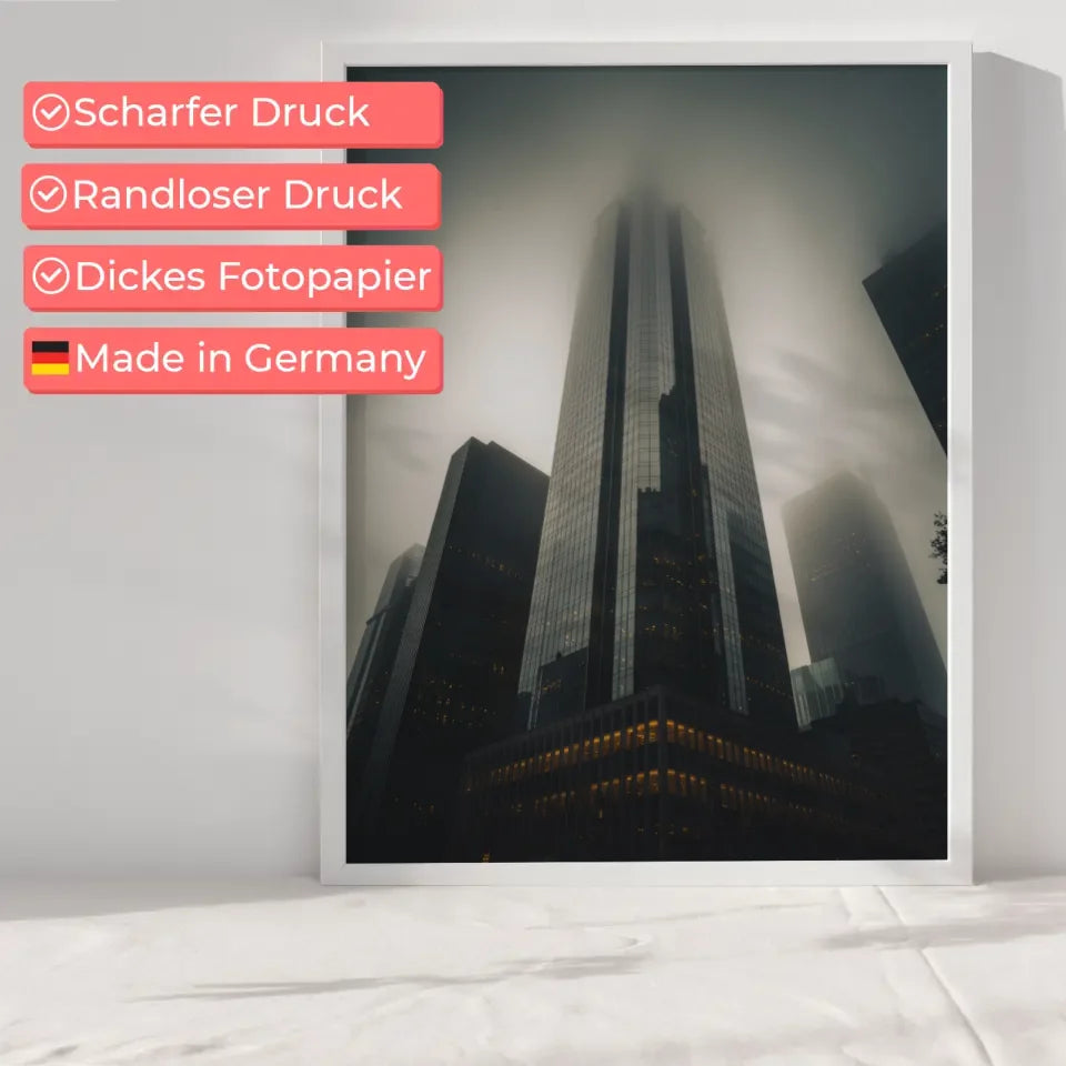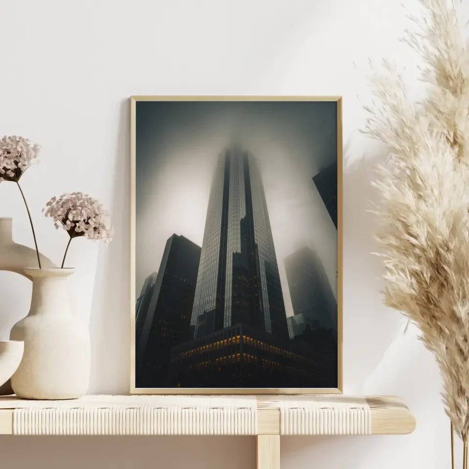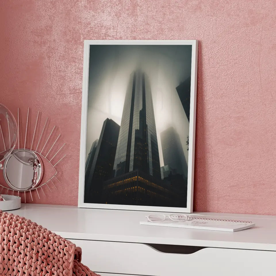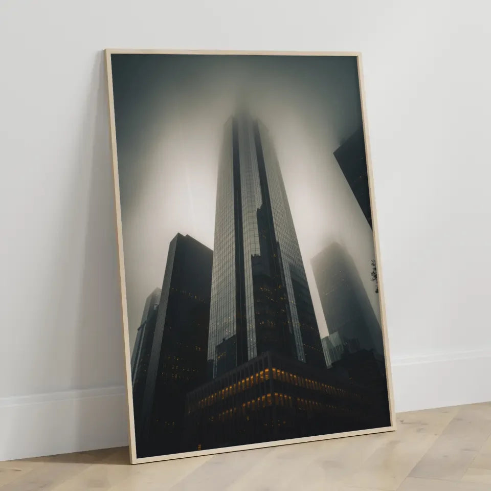 Eleganter Wolkenkratzer im Nebel Poster für stilvolle Wandgestaltung