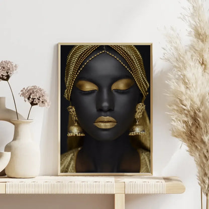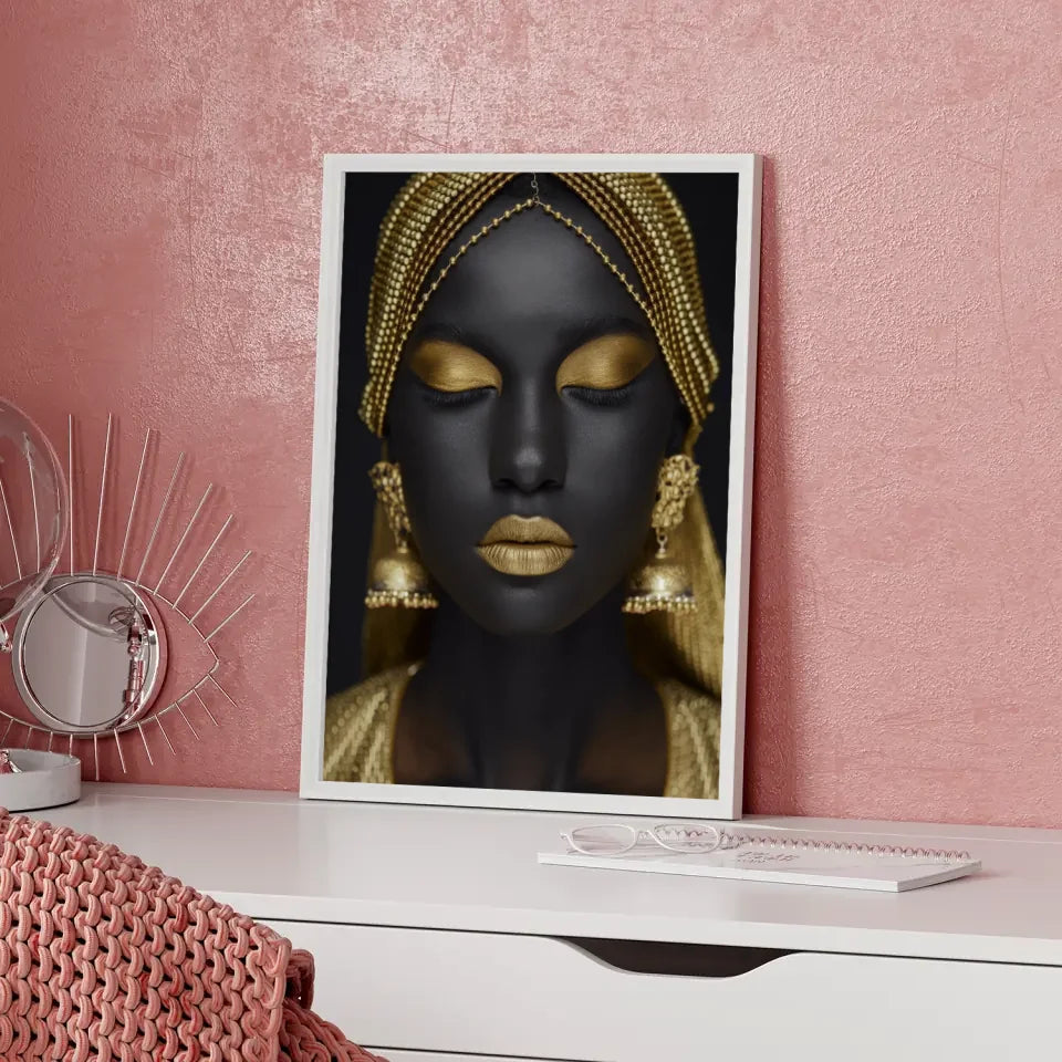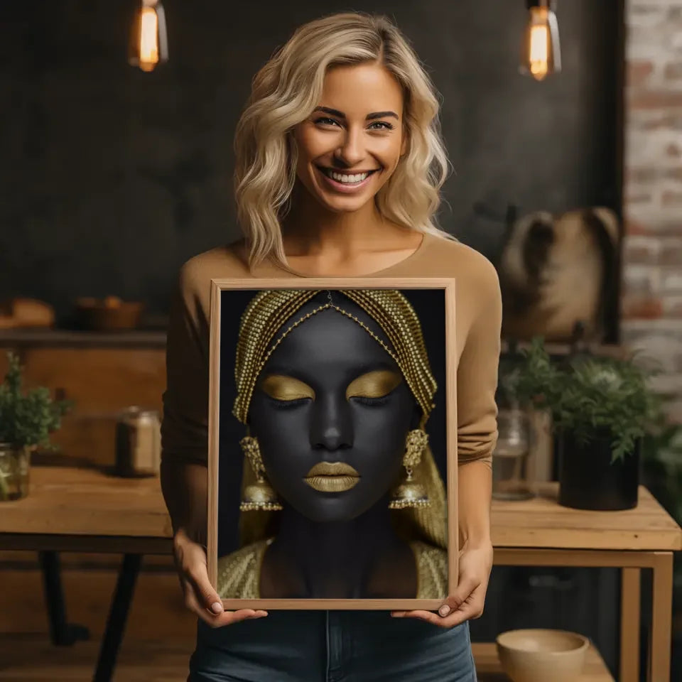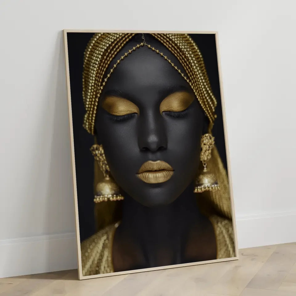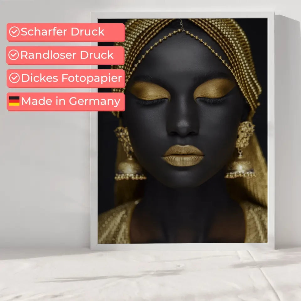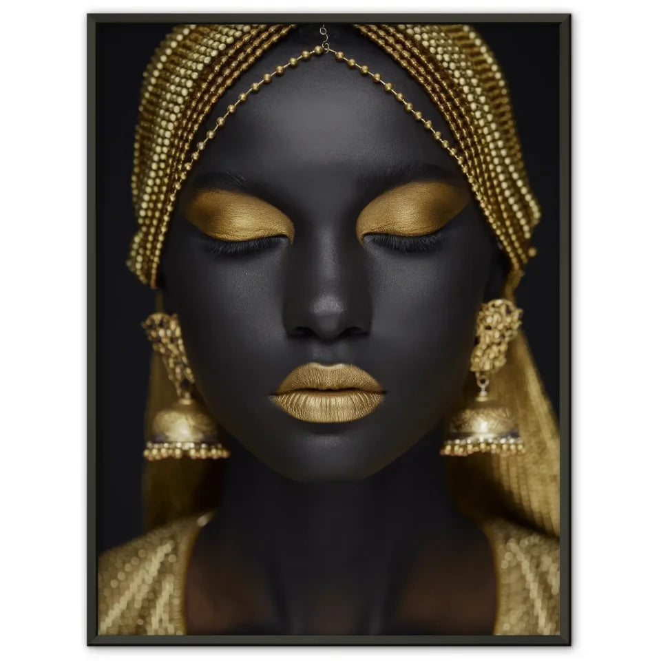 Entdecken Sie unser exklusives Poster mit einer atemberaubenden Nahaufnahme einer Frau, die durch elegante goldene Accessoires hervorgehoben wird. Dieses Poster ist Teil unserer Kategorie der Model Bilder und zeigt die Schönheit und Raffinesse in einem bemerkenswerten Design. Die frauenschönheit wird durch den dunklen Hintergrund perfekt akzentuiert, wodurch die goldenen Details des Kopfschmucks und der Ohrringe in den Fokus rücken. Die goldenen Elemente, einschließlich des metallischen Lippenstifts, verleihen diesem Poster einen eindrucksvollen Glanz, der jeden Raum aufwertet.