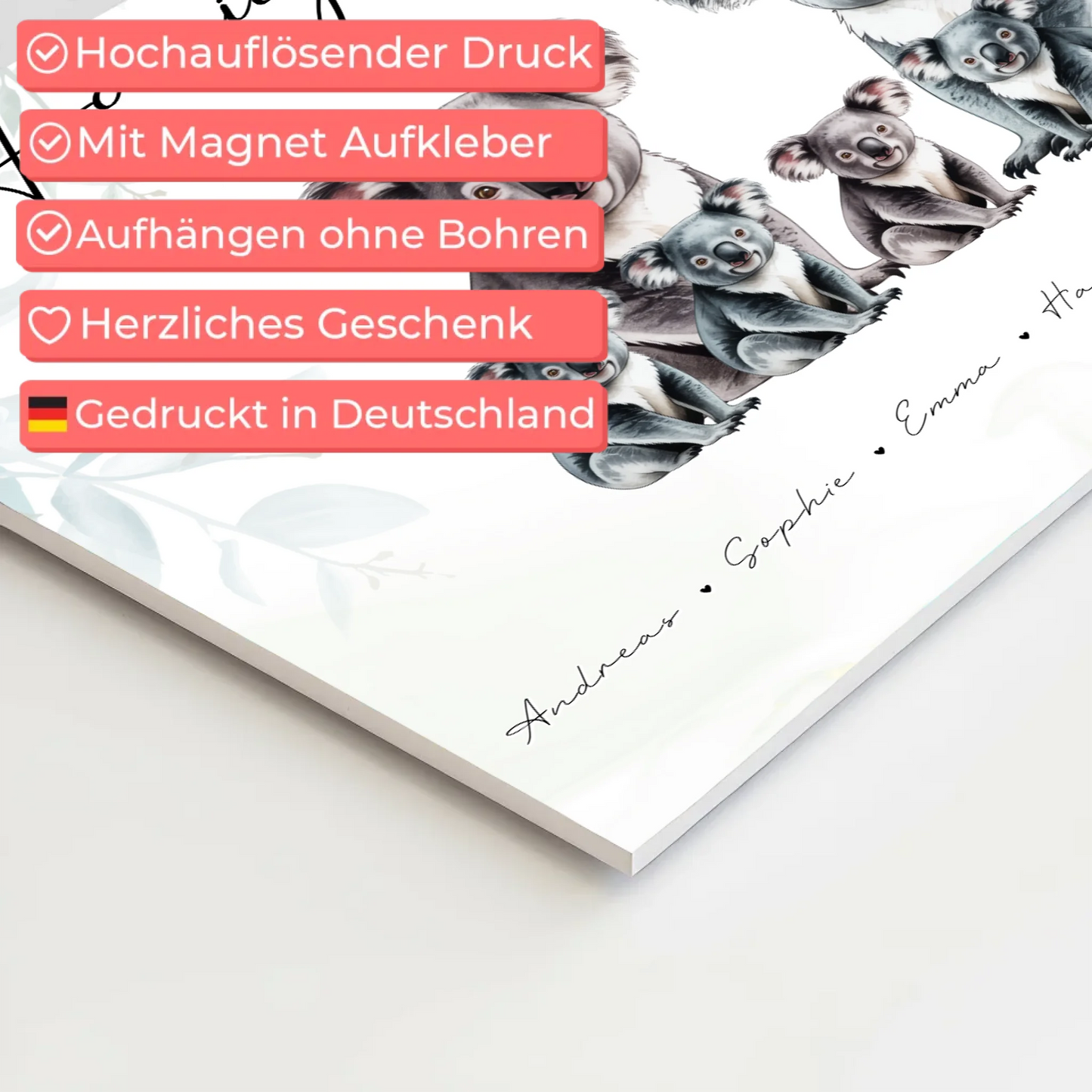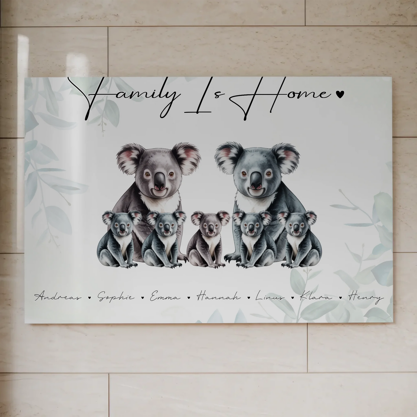 Entdecke das perfekte Familie Personalisiertes Fotoboard mit einem bezaubernden Koala Familienporträt, das deine Liebsten auf einzigartige Weise vereint. Dieses individuelle Geschenk für Oma Opa Mama Papa ist ideal, um besondere Momente und Familienbande stilvoll zu präsentieren. Du kannst bei diesem Familie Personalisiertes Fotoboard den Namen deiner Familie sowie einen eigenen Spruch oder Wunschtext hinzufügen, um es noch persönlicher zu gestalten. Ob für den Schwiegermuttergeschenk, zum Vatertaggeschenk, oder einfach als liebevolle Überraschung – dieses Familienporträt in Form eines Koalas bringt Freude und Wärme in jedes Zuhause. Das Motiv zeigt die Familie als niedliche Koalas, perfekt geeignet für Familien als Koala. Es ist ein einzigartiges Familienporträt, das sich hervorragend als Geschenk für Oma, Opa, Mama, Papa, Tochter, Sohn, Tante oder Onkel eignet. Überrasche deine Liebsten an jedem Anlass mit diesem besonderen personalisierten Geschenk und schaffe eine bleibende Erinnerung an eure gemeinsame Zeit.