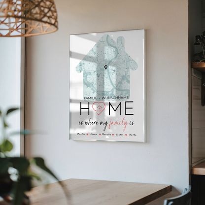 Familien Acrylglas Bild personalisiert Stadtkarte Home Is Where My Family Is Hausform mit Nachname