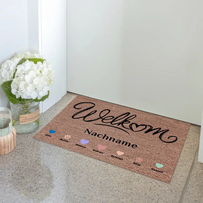 Familien Fussmatte mit Namen Willkommen auf Niederländisch Welkom mit Herzen und Haustieren