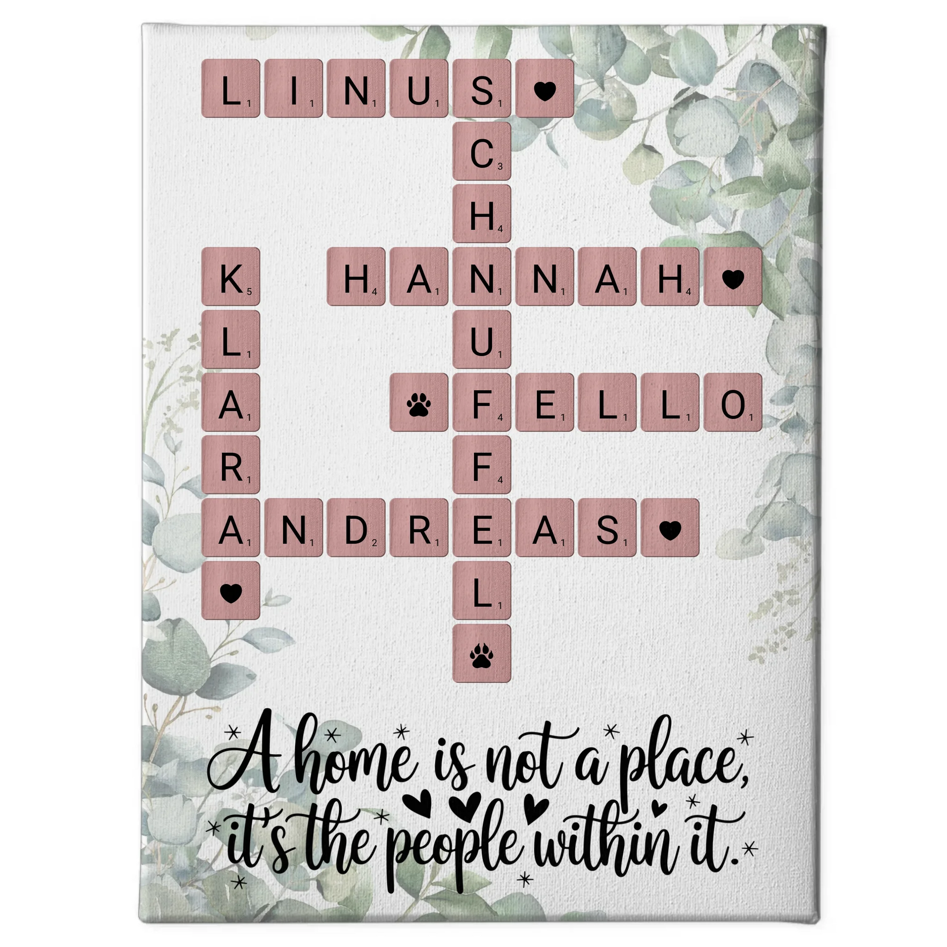 Entdecke die zauberhafte Familien Leinwand 'Home is Kreuzworträtsel mit Namen Wunschtext'