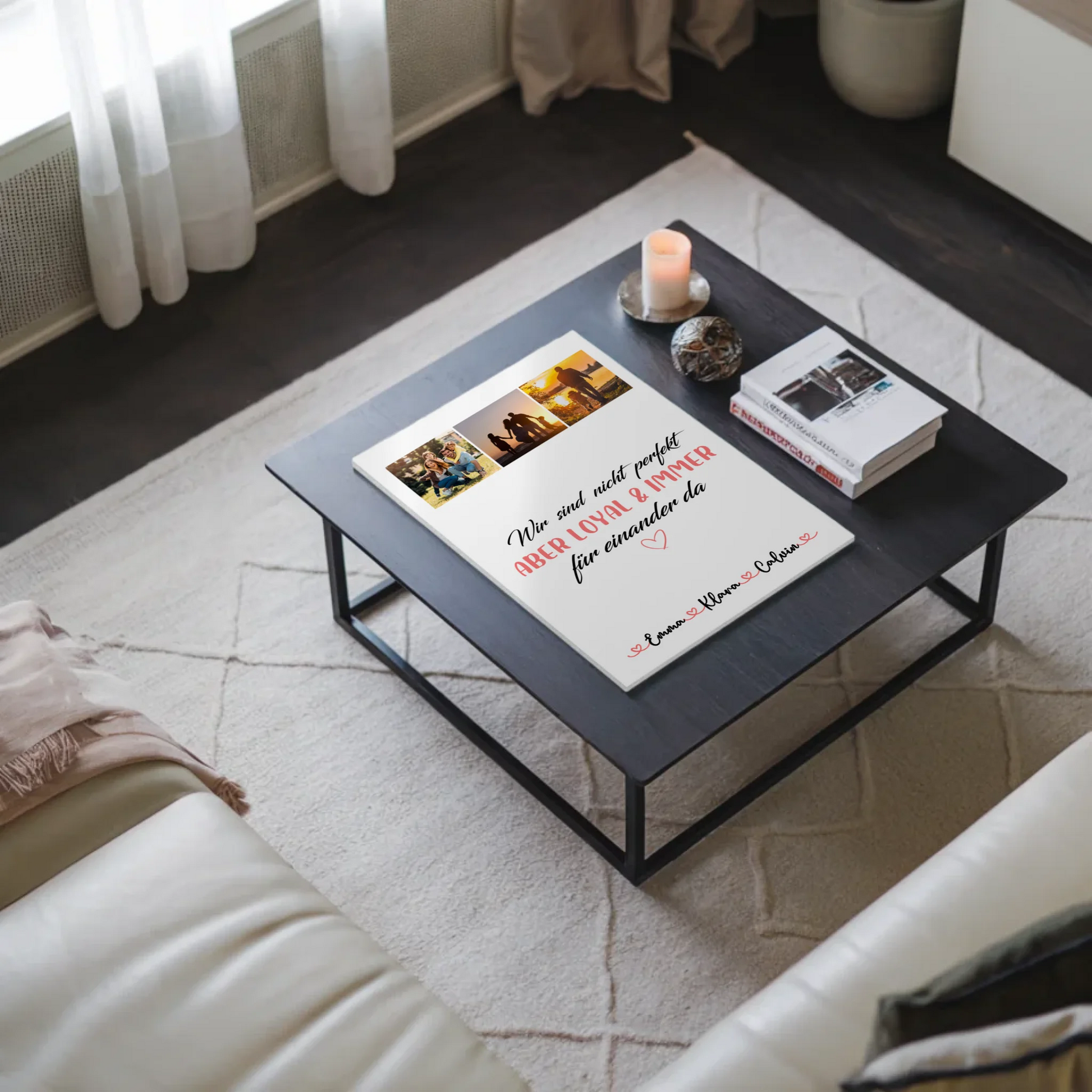 Das Design umfasst eine Fotocollage mit 3 Fotos, die du ganz nach deinem Geschmack farbig oder in Schwarz-Weiß-Optik wählen kannst. Der Hintergrund kann entweder weiß bleiben oder mit floralen Mustern, Wasserfarben-Style, Holz-Optik oder mit Mustern wie Sternen oder Blüten gestaltet werden. Auf dem Design ist der schöne Spruch: „Wir sind nicht perfekt aber loyal und immer füreinander da platziert, der die Verbundenheit deiner Familie perfekt widerspiegelt. Dieses personalisierte Geschenk ist ideal für Familienmitglieder und zeigt deine Wertschätzung auf eine besondere Art und Weise.