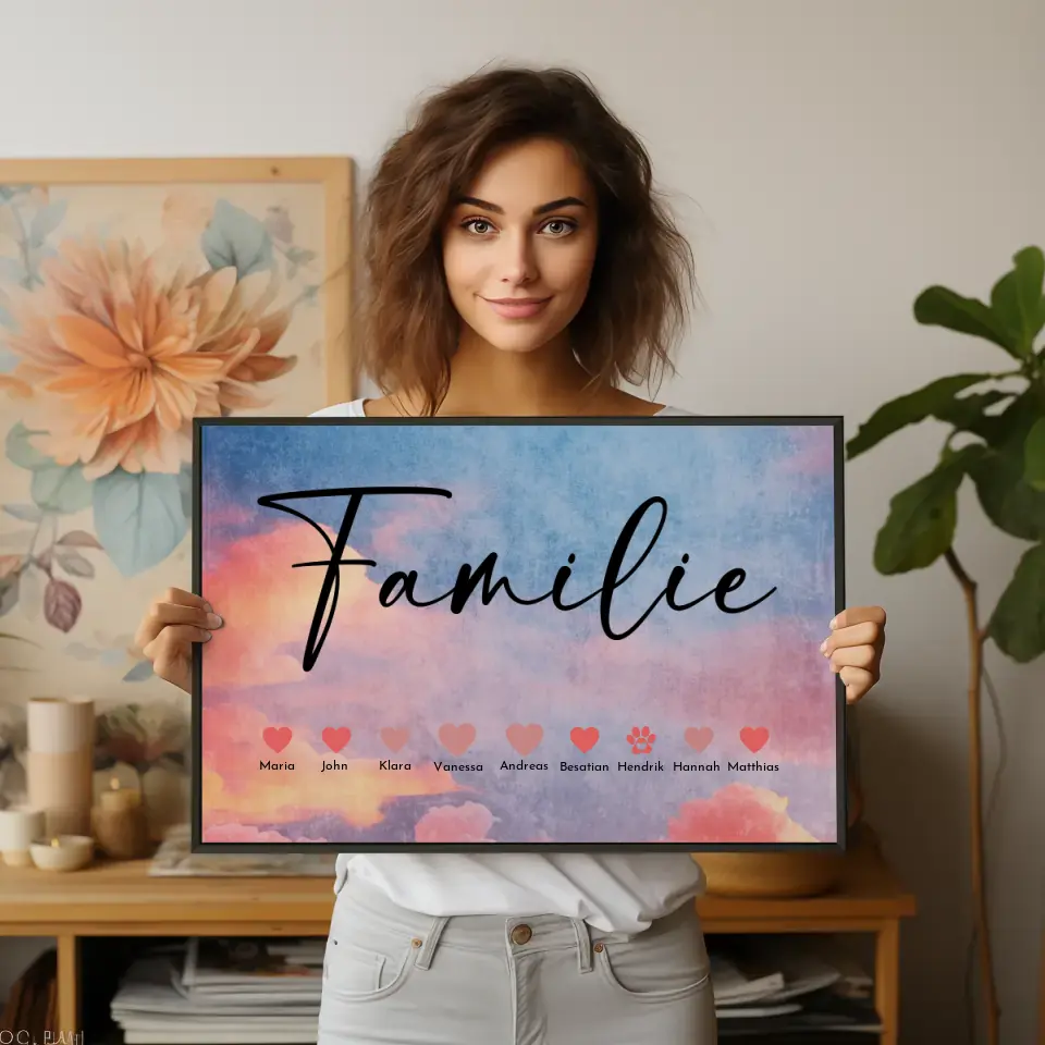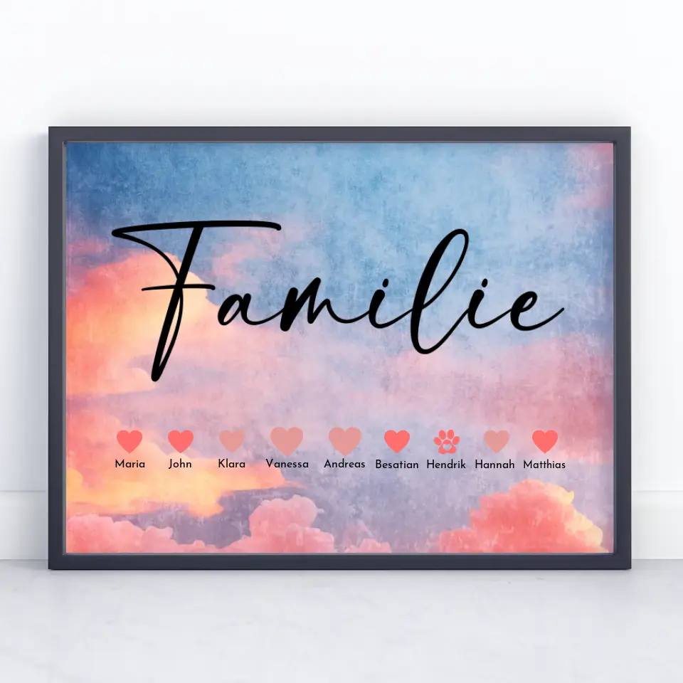 Du möchtest etwas einzigartiges verschenken? Dann ist unser Familienposter mit Namen Eltern Kinder Katze Hund Bis 20 Namen das perfekte personalisierbare Geschenk.
