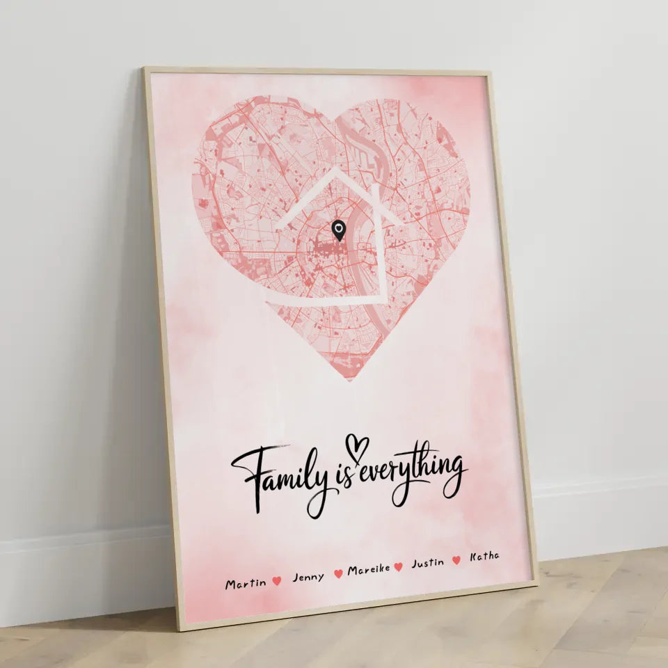 Familienposter personalisiert Stadtkarte Herz Form mit Nachname Family Is Everything