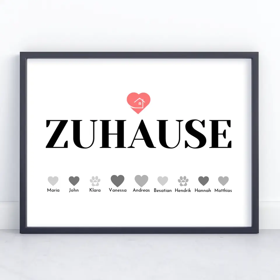 Du möchtest etwas einzigartiges verschenken? Dann ist unser Familienposter Zuhause Bis zu 20 Namen Eltern Kinder Katze Hund Pferd das perfekte personalisierbare Geschenk.