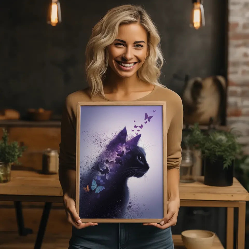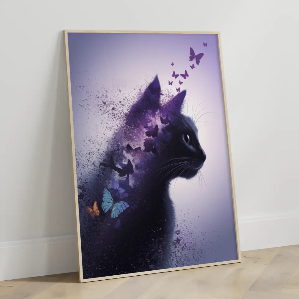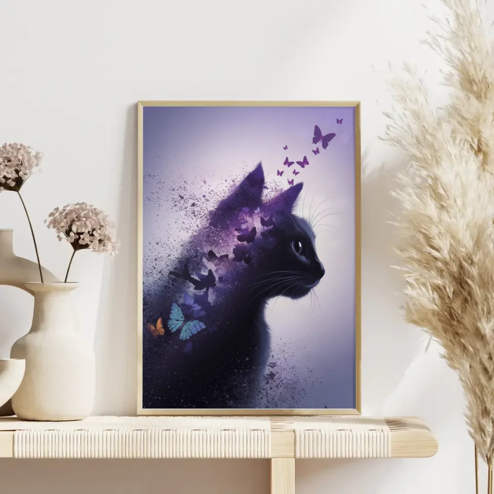 Bringen Sie mit unserem faszinierenden Katzenkopf Poster mit Schmetterlingen und sanften Farben ein Stück Natur und Kunst in Ihre Räume und genießen Sie die harmonische Verbindung von Tierwelt und künstlerischem Ausdruck. Bestellen Sie noch heute und verwandeln Sie Ihre Wände in ein atemberaubendes Kunstwerk!