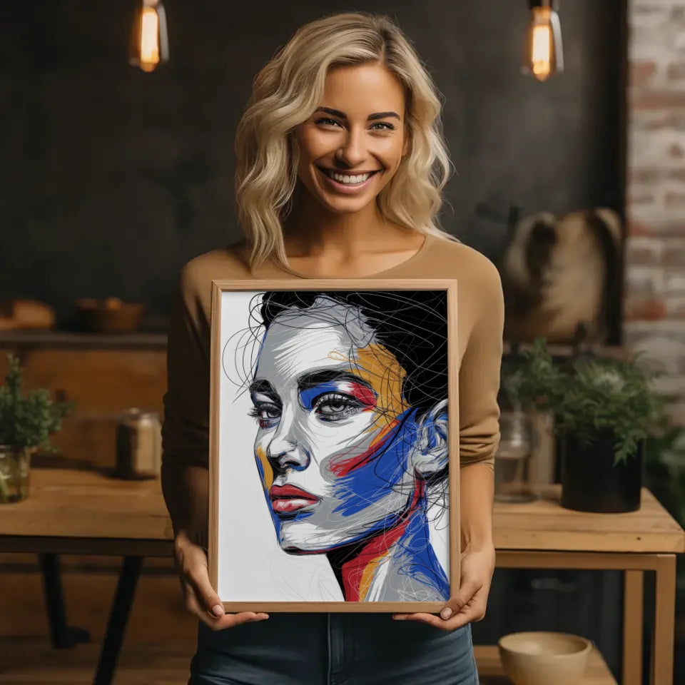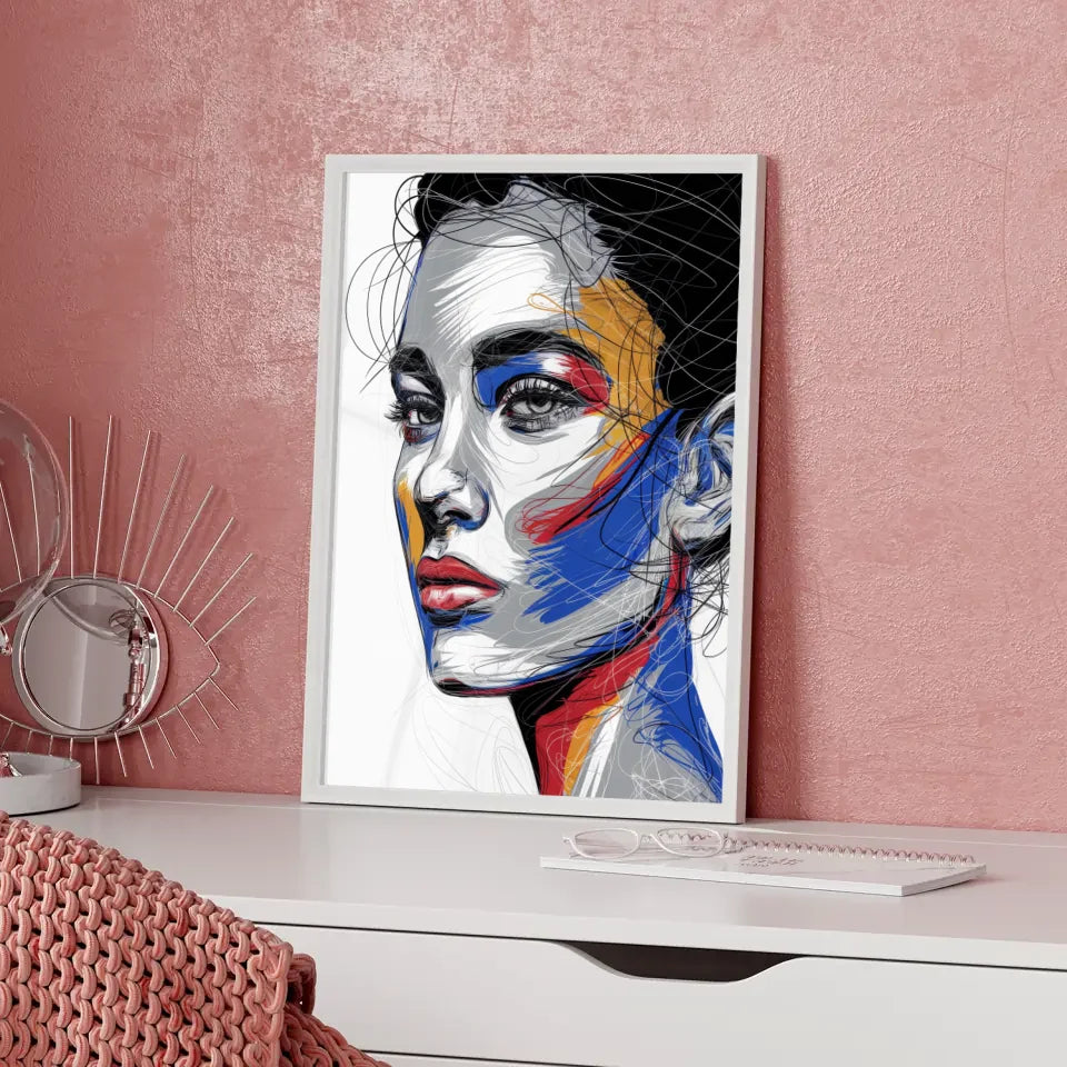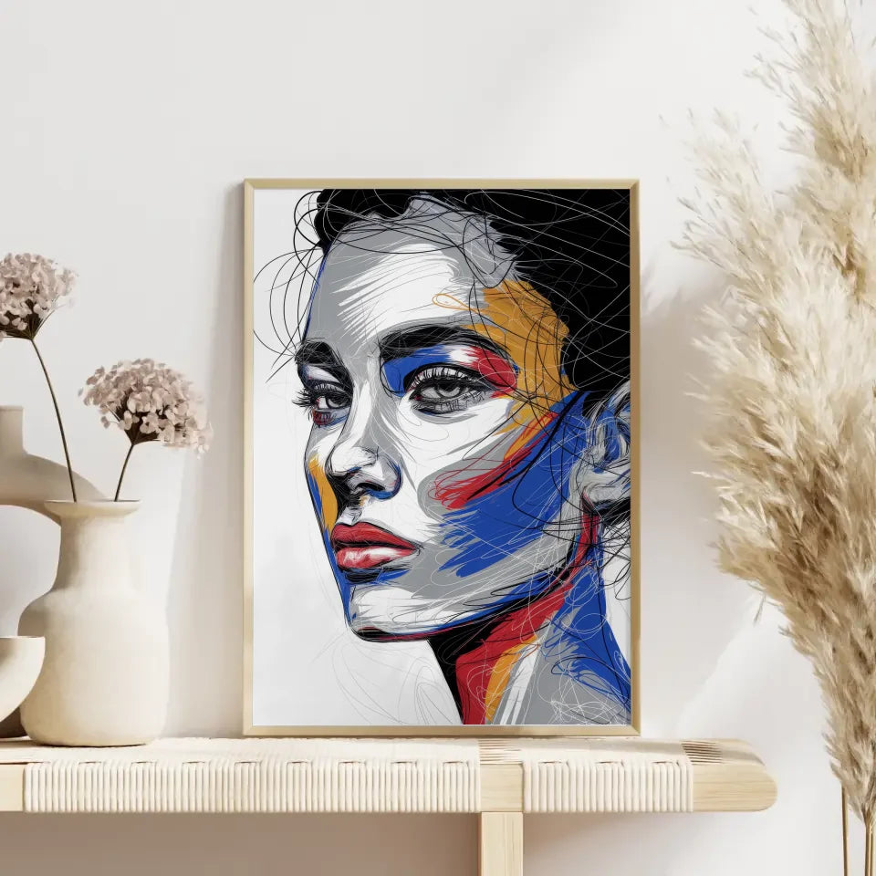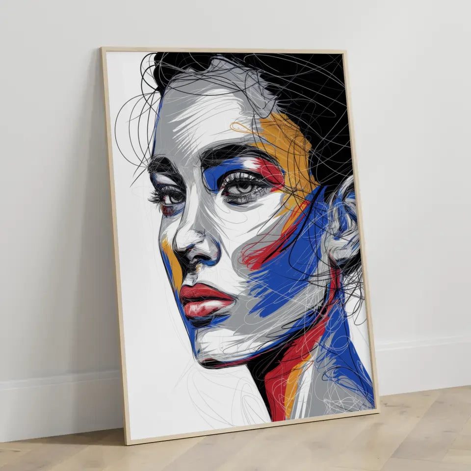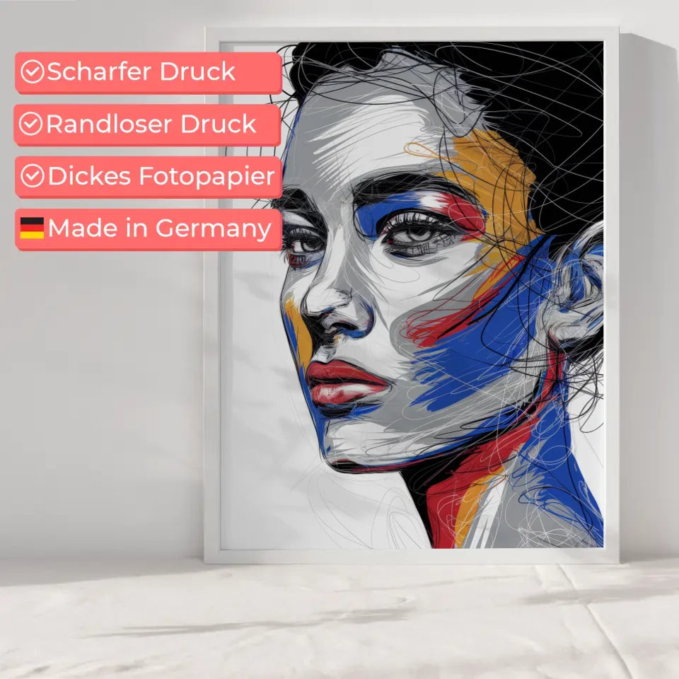 Entdecken Sie unser atemberaubendes Poster einer Frau im Scribble Stil, das Ihre Wände mit einem Hauch von Minimalismus und Kunst aufwertet. Dieses einzigartige Kunstwerk zeigt ein beeindruckendes Nahaufnahmeporträt einer schönen Frau, die in einem kreativen Scribble-Stil mit schwarzen Tuschekonturen dargestellt ist. Die leuchtenden Farben wie Blau, Weiß, Rot und Orange bringen das Gesicht der Protagonistin zum Leben und ziehen alle Blicke auf sich.