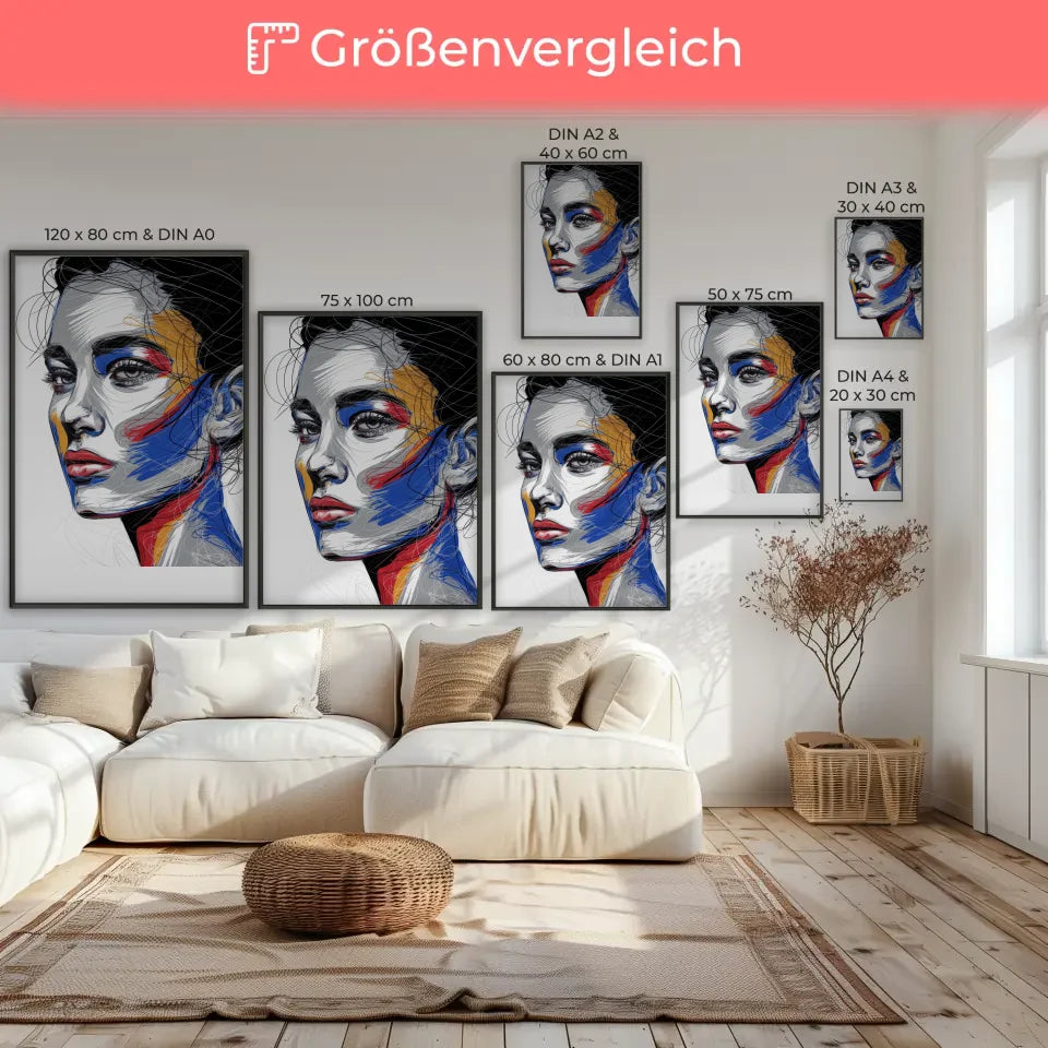 Das Poster besticht durch die einzigartige Perspektive, aus der das Gesicht der Frau betrachtet wird. Die Seitenansicht offenbart die faszinierenden Details von Augen, Nase und Lippen, als wäre die Zeichnung aus einem frischen, neuen Blickwinkel entstanden. Der reinweiße Hintergrund hebt die komplexen Details und kräftigen Farben des Porträts perfekt hervor und sorgt dafür, dass dieses Kunstwerk in jedem Raum zum Highlight wird.
