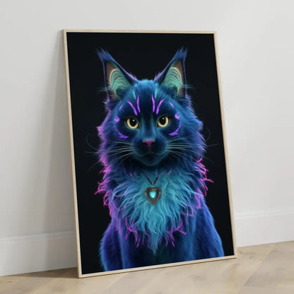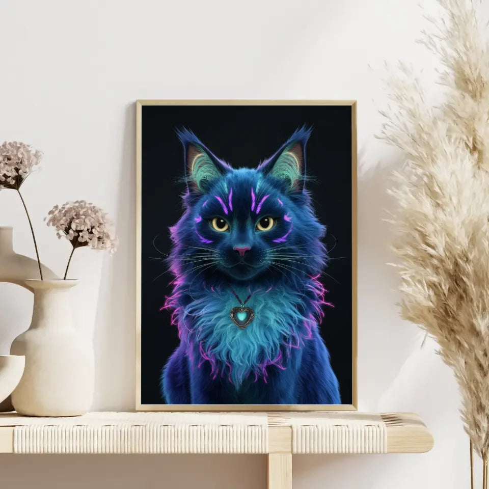 Entdecken Sie unser einzigartiges Poster, das eine fesselnde Fantasy-Katze in einem auffälligen neon Design zeigt. Dieser Poster ist nicht nur ein Blickfang für jeden Raum, sondern auch ein Statement für Tierliebhaber und Kunstenthusiasten. Die Katze wird durch ihr tiefblaues Fell mit lebendigen neonartigen Akzenten in Lila und Blaugrün zum Leben erweckt, was einen faszinierenden visuellen Effekt erzielt. Ihre beeindruckenden gelben Augen sowie der herzförmige Anhänger verleihen dem Gesamtbild eine mystische Aura, die den Betrachter in ihren Bann zieht.