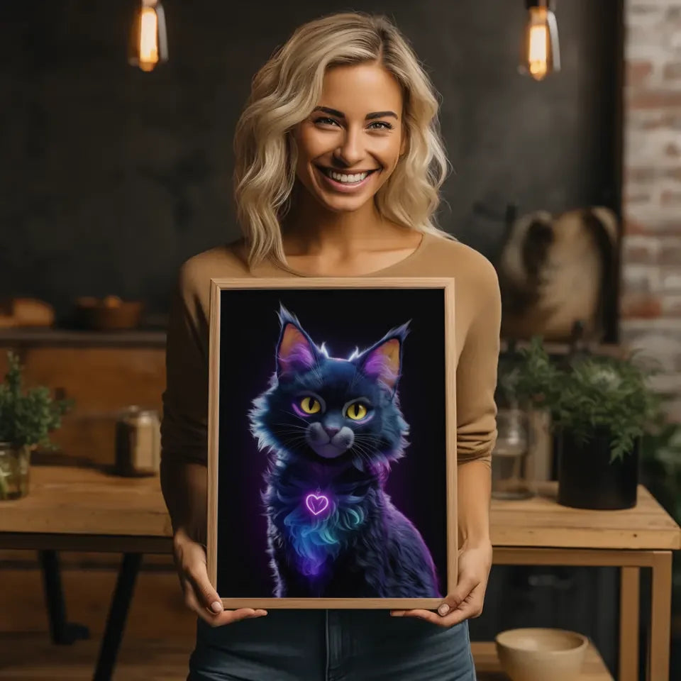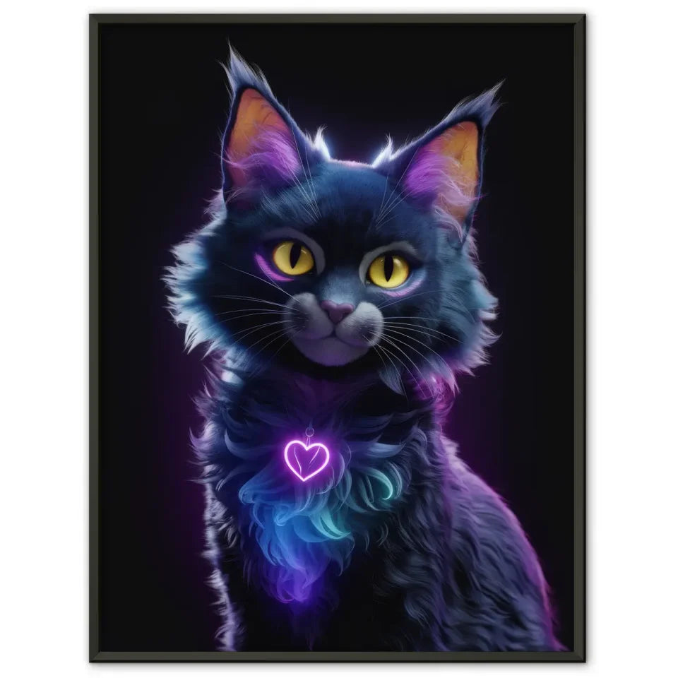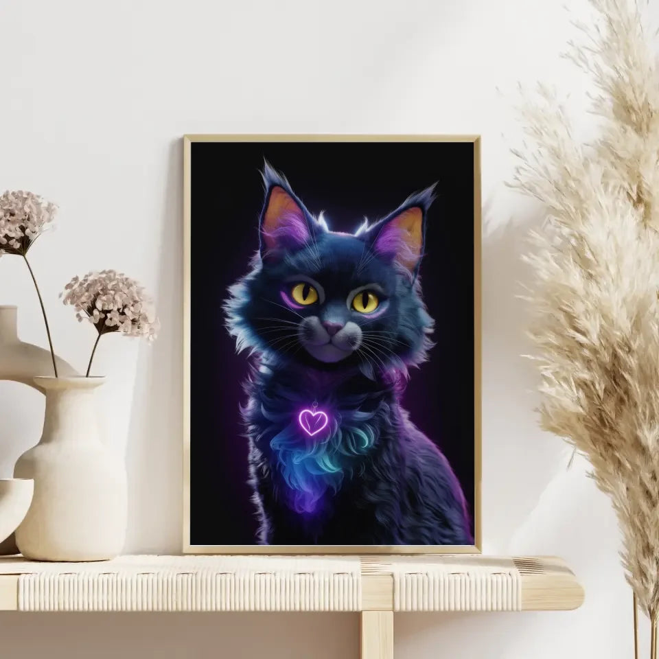 Entdecken Sie unser einzigartiges Poster, das eine fesselnde Fantasy-Katze in einem auffälligen neon Design zeigt. Dieser Poster ist nicht nur ein Blickfang für jeden Raum, sondern auch ein Statement für Tierliebhaber und Kunstenthusiasten. Die Katze wird durch ihr tiefblaues Fell mit lebendigen neonartigen Akzenten in Lila und Blaugrün zum Leben erweckt, was einen faszinierenden visuellen Effekt erzielt. Ihre beeindruckenden gelben Augen sowie der herzförmige Anhänger verleihen dem Gesamtbild eine mystische Aura, die den Betrachter in ihren Bann zieht.