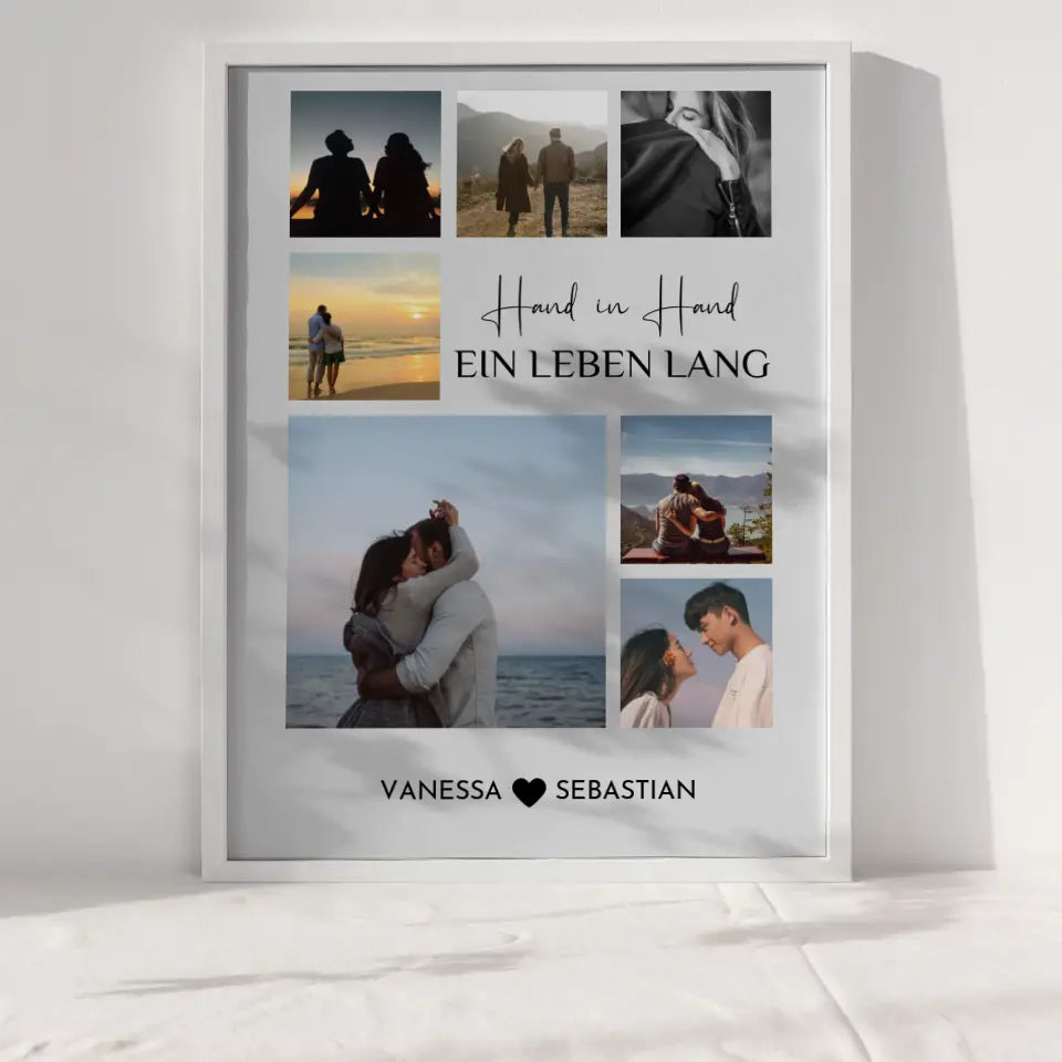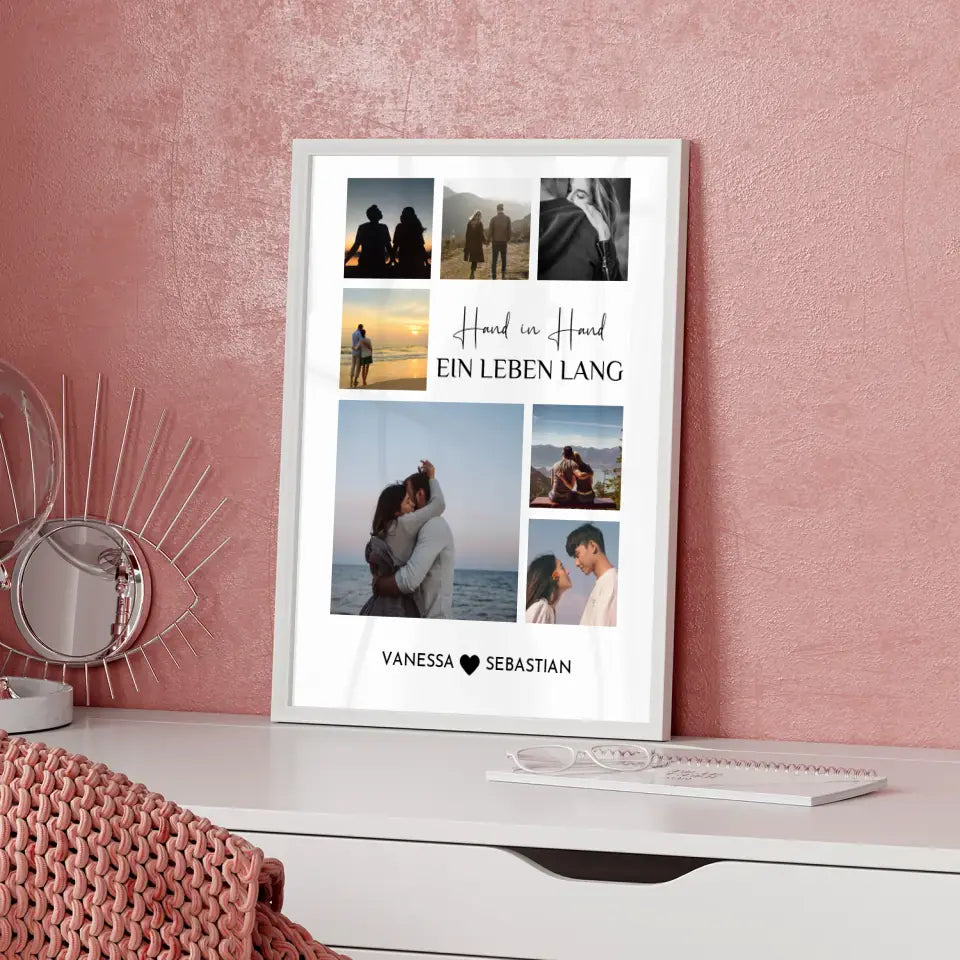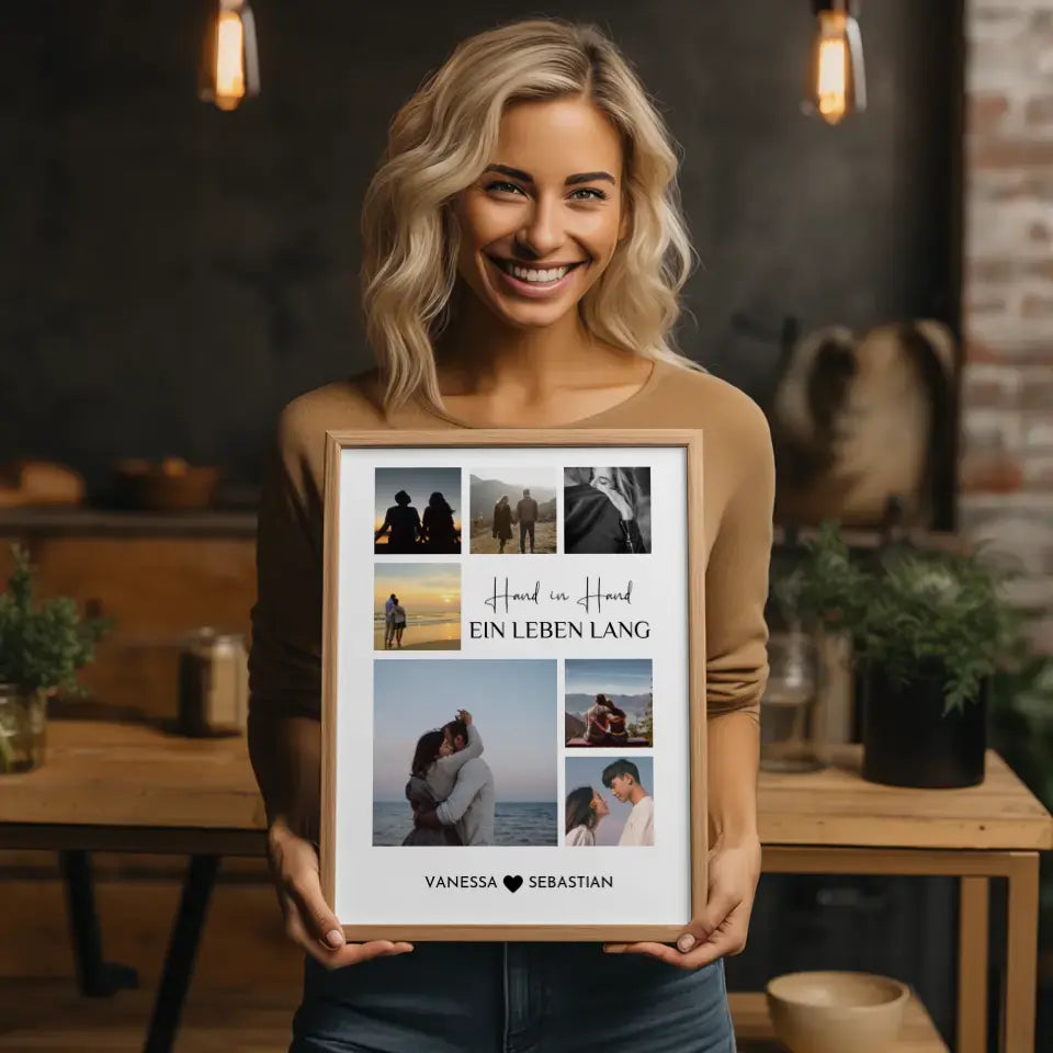 Du würdest gerne etwas einzigartiges schenken? Dann ist unser Foto Collage für Freundin Hand in Hand Mit Fotos & Namen das perfekte personalisierbare Geschenk.