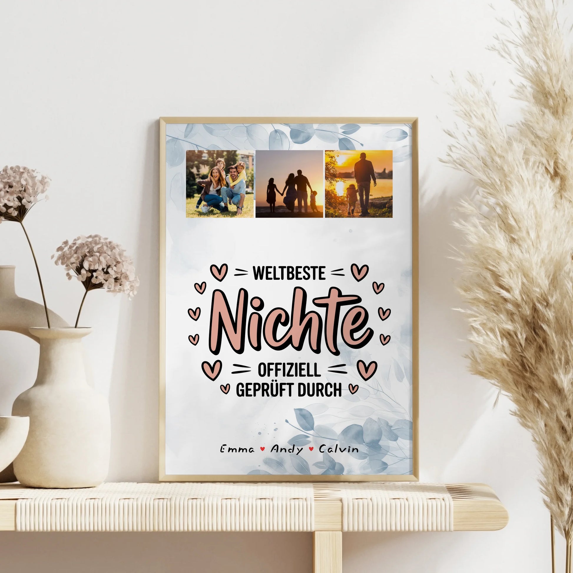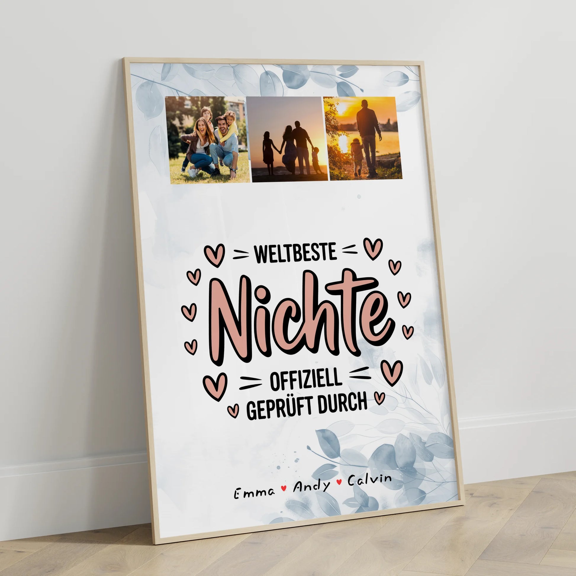 Entdecke das einzigartige Produkt „Foto Collage Poster Erstellen Nichte Fotocollage Weltbeste Nichte Offiziell Geprüft Durch - dein persönliches Geschenk, das garantiert für Freude sorgt. Dieses individuell gestaltbare Poster ist ideal für jeden Anlass und eignet sich perfekt als Fotocollage für Nichte. Gestalte dein persönliches Geschenk, indem du 3 Fotos, Namen und ein Hintergrundbild nach Wahl hochlädst. Das Design überzeugt durch eine stilvolle Fotocollage mit 3 Fotos, die du entweder farbig oder in Schwarz-Weiß-Optik wählen kannst. Der Hintergrund kann ganz nach deinem Geschmack gestaltet werden: Weiß, florale Muster, Wasserfarben-Style, Holz-Optik oder mit Mustern wie Sterne oder Blüten. Das Design ist mit dem Spruch „Weltbeste Nichte Offiziell Geprüft Durch versehen, der das Geschenk noch persönlicher macht. Dieses personalisierte Poster ist das perfekte Geschenk für deine Nichte zu jedem Anlass und zeigt deine Wertschätzung auf besondere Weise. Überrasche deine Nichte mit einem einzigartigen, individuell gestalteten Geschenk, das sie garantiert begeistern wird. Bestelle jetzt dein personalisiertes Foto Collage Poster Erstellen Nichte und mache deiner Nichte eine unvergessliche Freude!