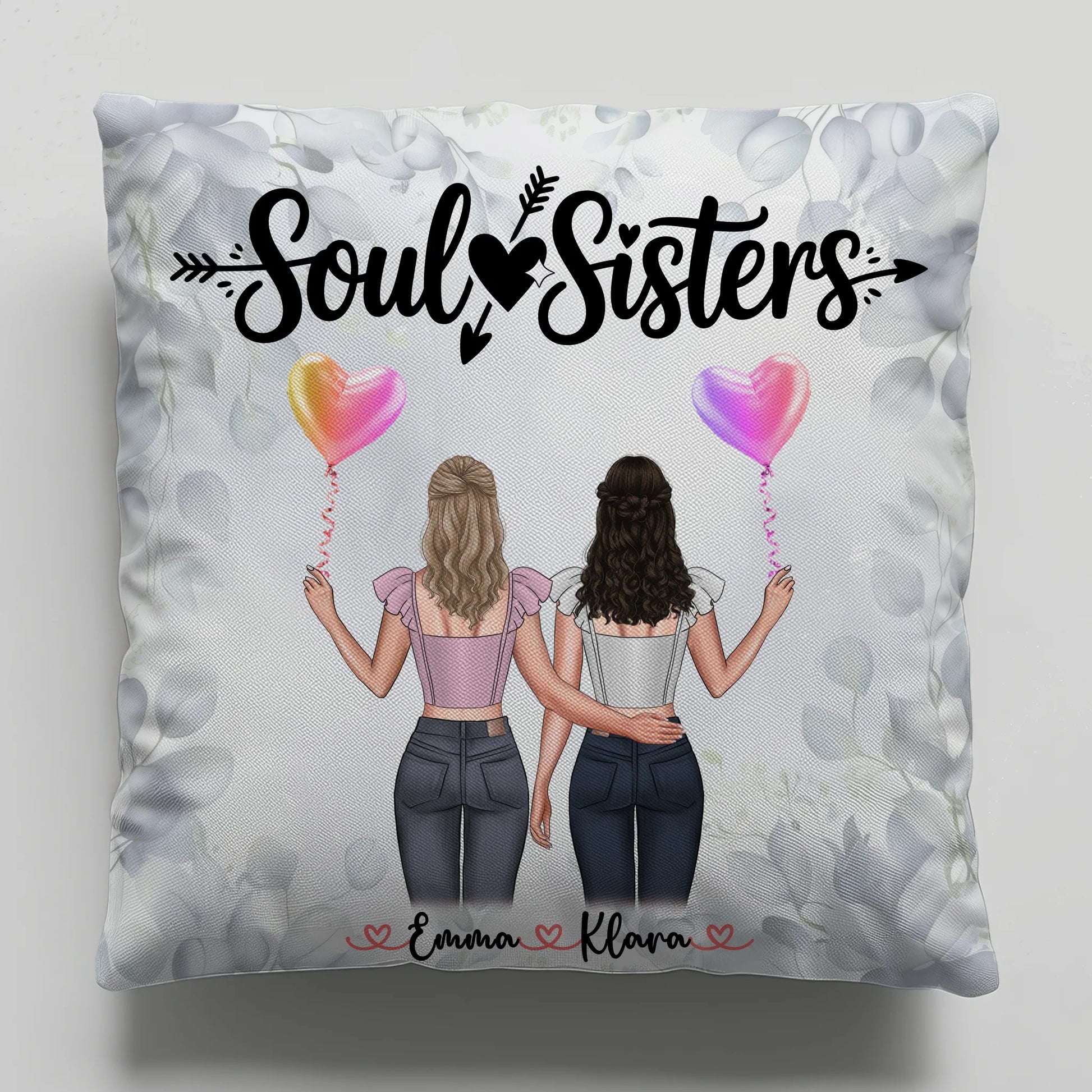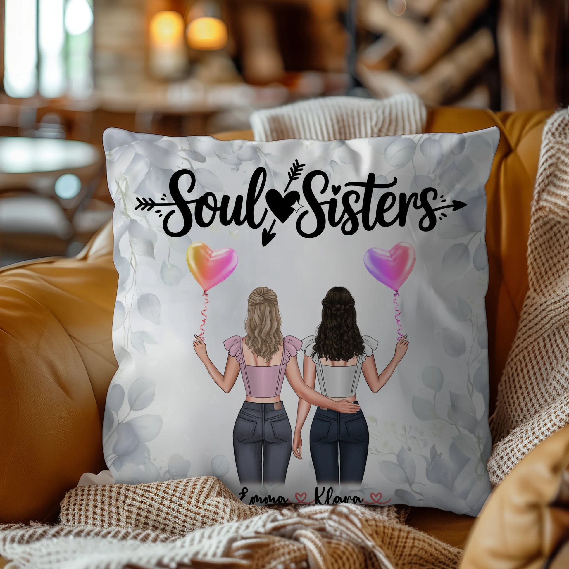 Mit dem personalisierten Foto Kissen Mit Namen Beste Freundin 2 Clipart Frauen, Hintergrund & Wunschtext schenkst du deiner besten Freundin zum Geburtstag ein besonderes Erinnerungsstück. Auf dem Design steht Soul Sisters und du kannst 2 Clipart Frauen, die Namen, das Hintergrundbild und einen eigenen Spruch oder Wunschtext individuell anpassen. So entsteht ein emotionales, persönliches Geschenk, das im Alltag und auf dem Sofa immer wieder Freude macht.