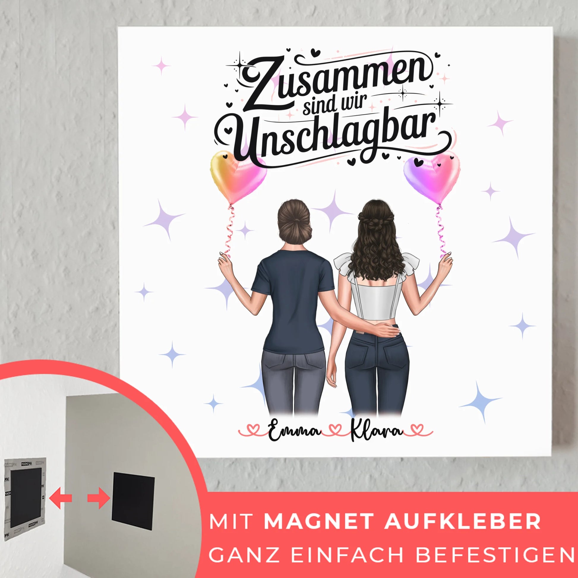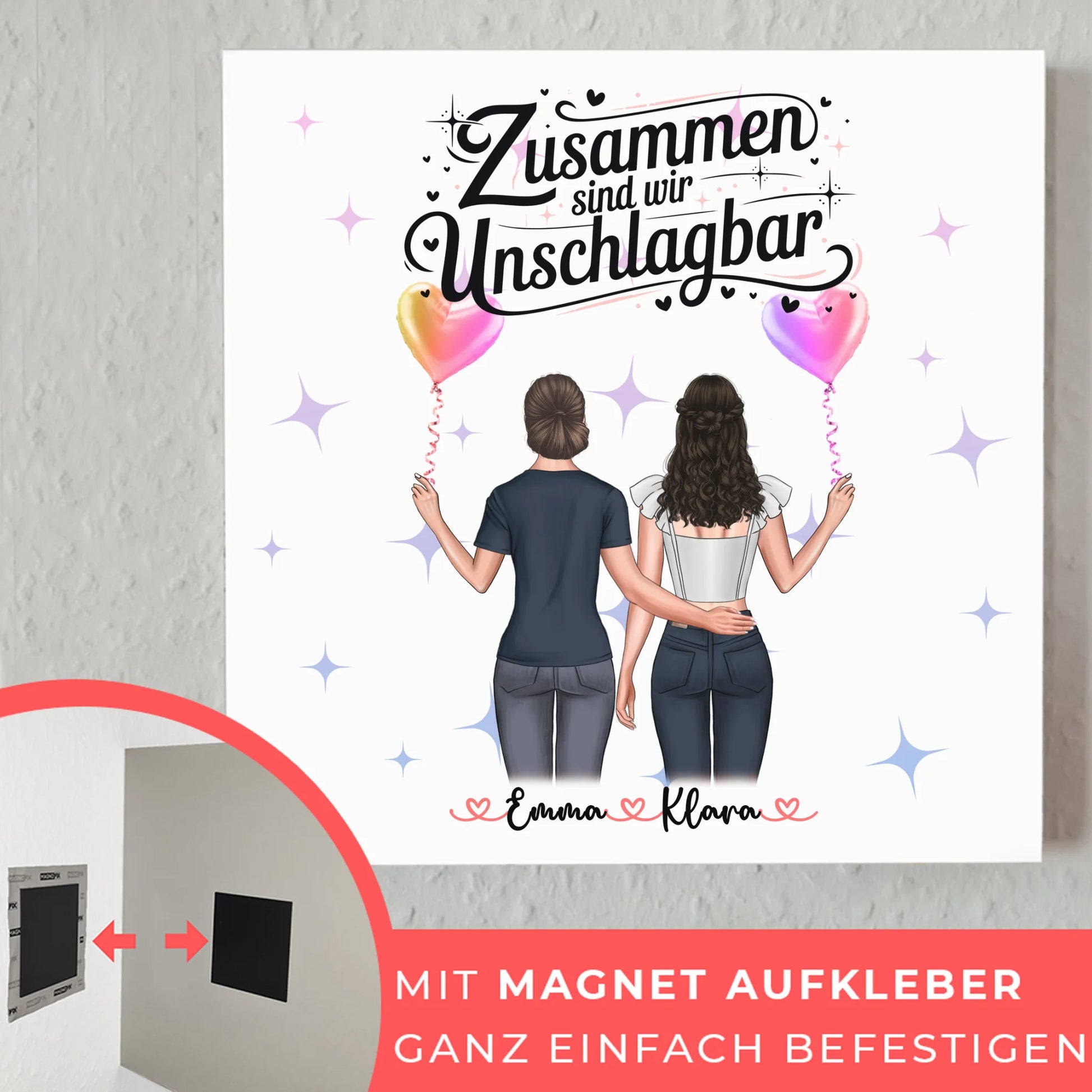 Stell Dir vor, Du überreichst Deiner besten Freundin an ihrem Geburtstag ein Fotoboard, das sofort ein Lächeln aufs Gesicht zaubert und Erinnerungen lebendig werden lässt. In dieser Geschichte seid Ihr die Hauptdarstellerinnen: zwei individuelle Clipart Frauen, Eure Namen und ein persönlicher Spruch, der alles sagt. Auf dem Design steht der schöne Spruch: Zusammen sind wir unschlagbar, doch Du kannst ihn jederzeit durch einen eigenen Wunschtext ersetzen oder einen aus über 100 Sprüchen auswählen. Dieses Fotoboard ist personalisierbar und perfekt für die beste Freundin, weil es nicht nur dekorativ ist, sondern auch Eure gemeinsame Geschichte erzählt und zum Blickfang im Wohnzimmer wird.