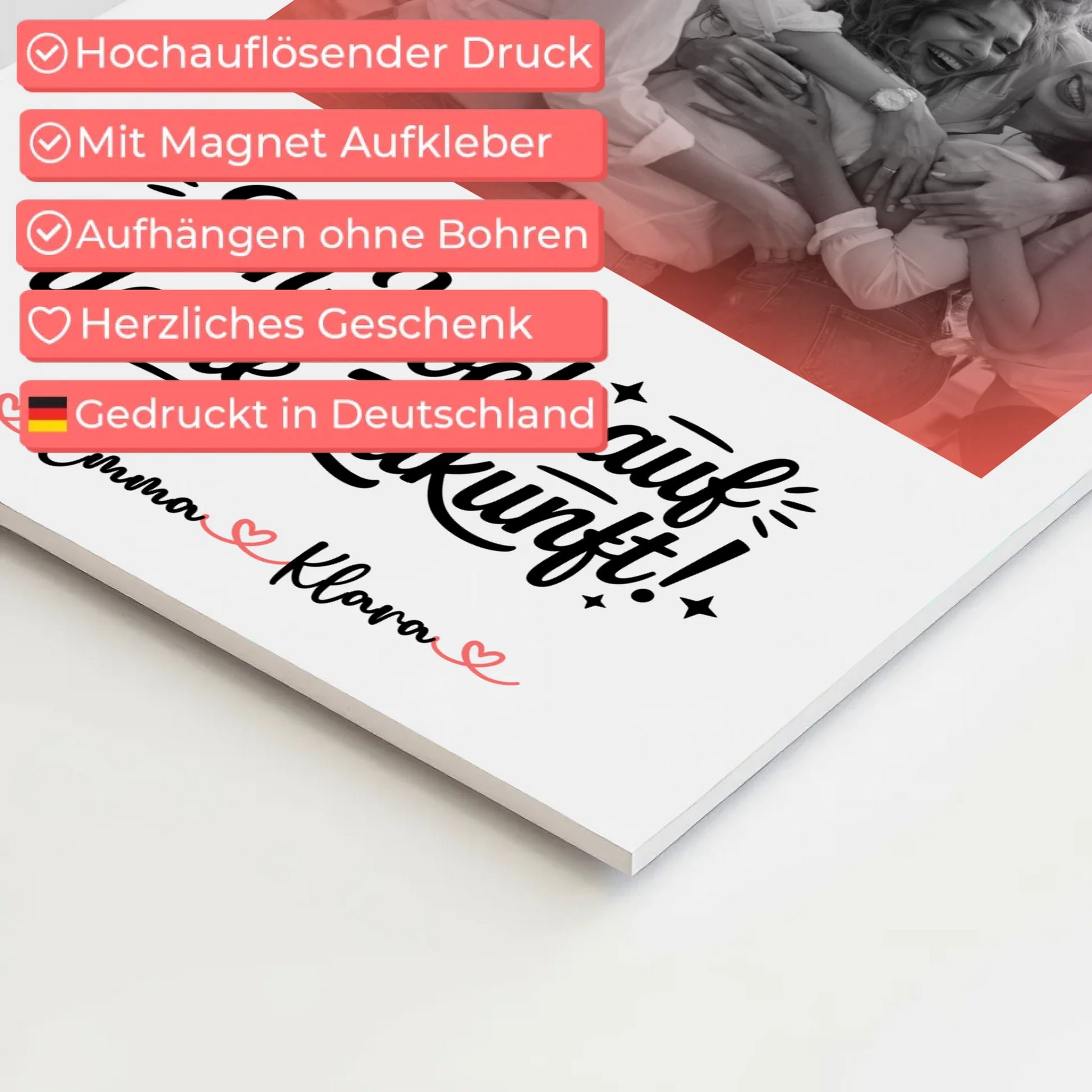 Personalisiertes Fotoboard für deine Chefin zum Abschied: Du gestaltest 1 Foto, Hintergrundbild, Namen und einen eigenen Wunschtext und schaffst so ein einzigartiges Fotogeschenk für den Abschied im Team. Das Design bietet die elegante Black & White Optik sowie eine farbige Variante und setzt persönliche Erinnerungen stilvoll in Szene. Der schöne Spruch Ein Hoch auf deine Zukunft! ist bereits im Design enthalten, du kannst ihn aber durch einen eigenen Wunschtext ersetzen.