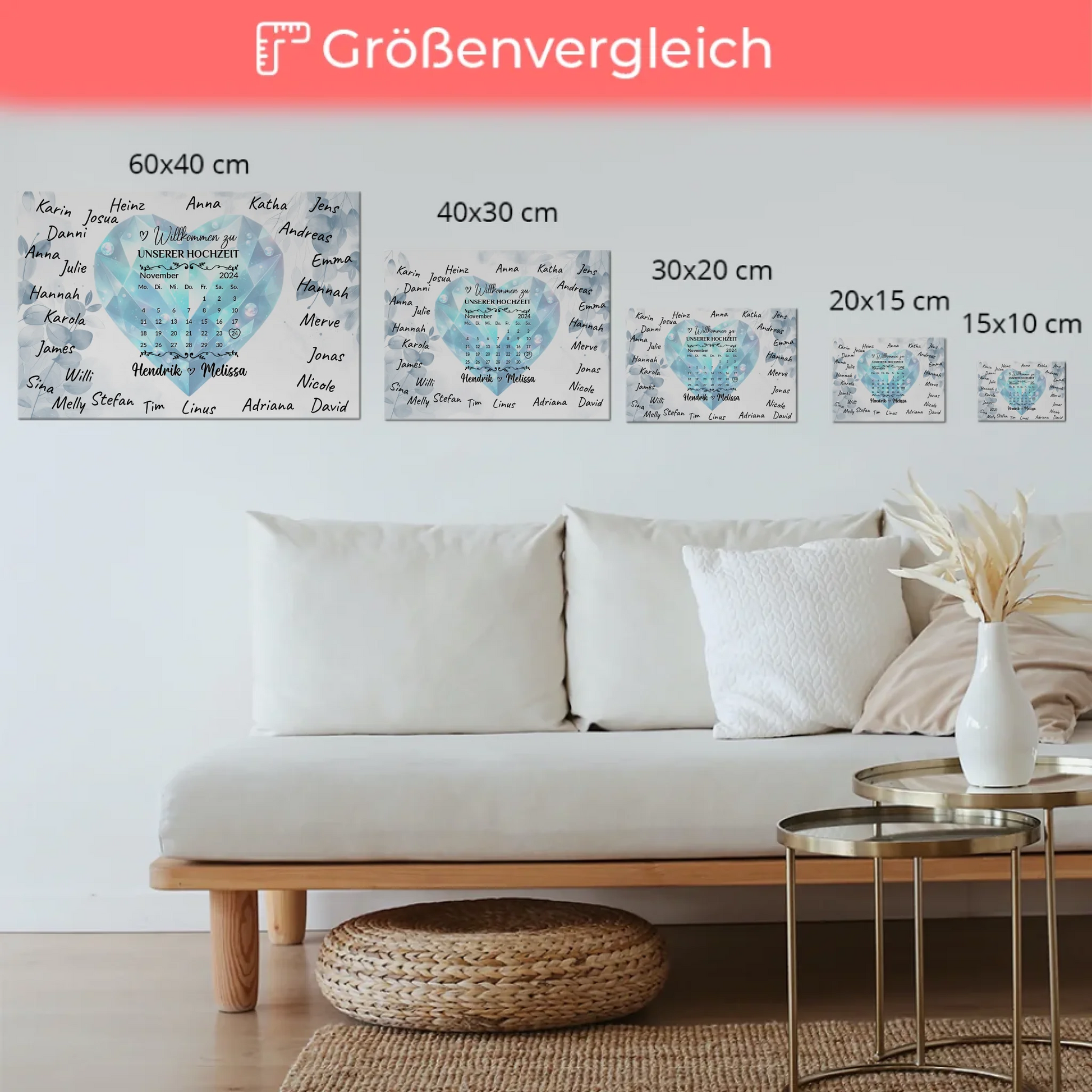 Gestalte dein Hochzeit Willkommensschild ganz nach deinen Wünschen. Du kannst das Datum und die Namen des Brautpaares hinzufügen, um es noch persönlicher zu machen. Wähle aus verschiedenen Hintergrundbildern, die perfekt zu deinem Hochzeitsmotto passen. Das Highlight: Es bietet Platz für eigene Unterschriften, sodass deine Gäste ihre besten Wünsche hinterlassen können (Stift nicht im Lieferumfang).