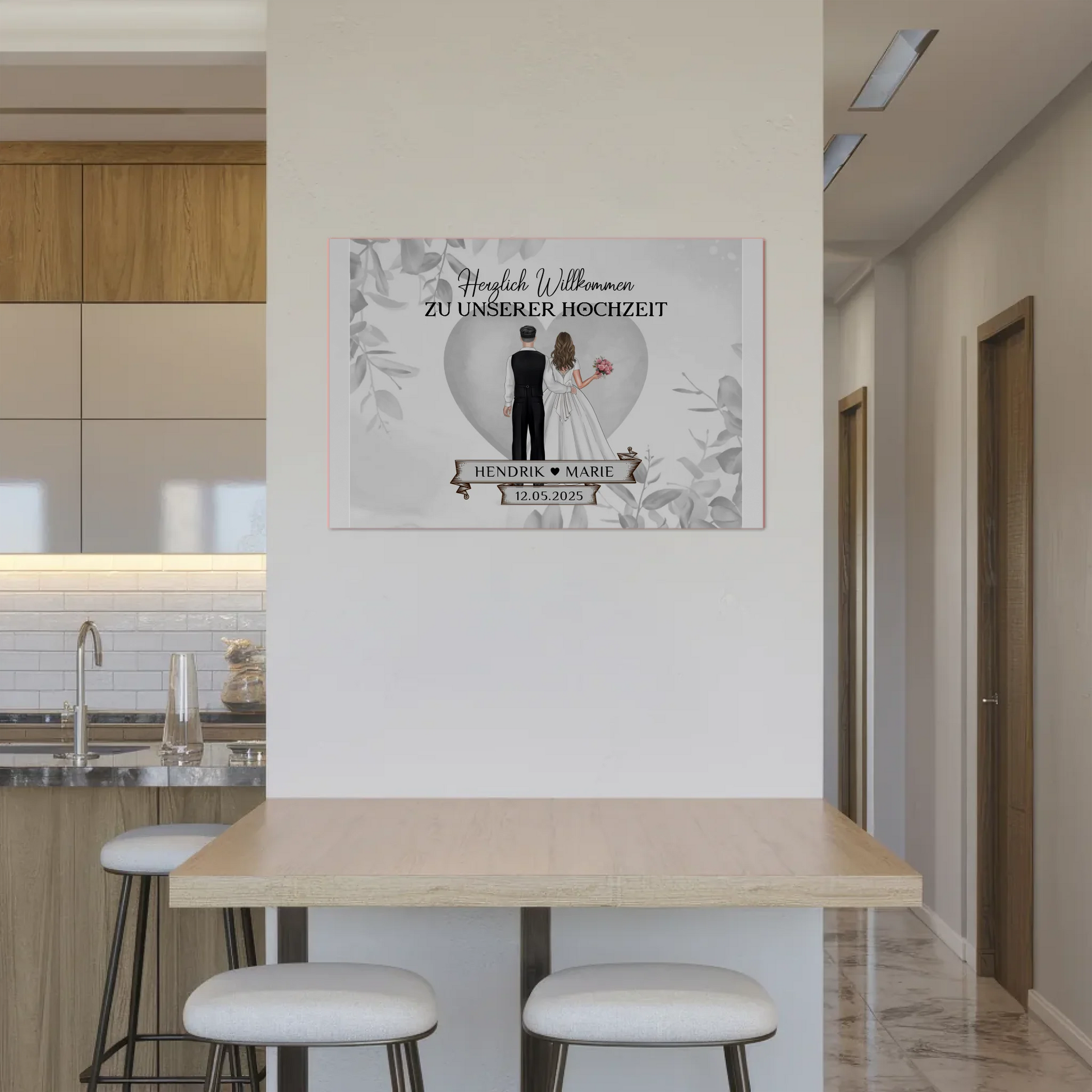 Mache deinen Hochzeitstag unvergesslich mit einem individuell gestalteten Willkommensschild. Jetzt online dein Willkommensschild gestalten, mit Namen und Datum der Hochzeit personalisieren und deine Gäste stilvoll begrüßen!
