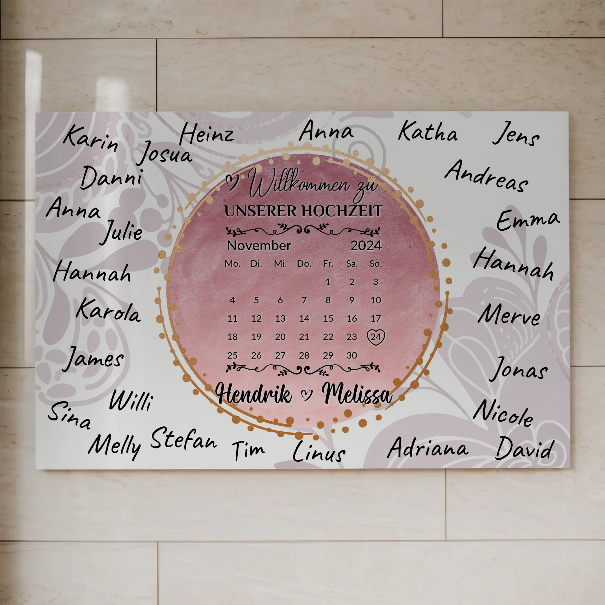 Gestalte dein Hochzeit Willkommensschild ganz nach deinen Wünschen. Du kannst das Datum und die Namen des Brautpaares hinzufügen, um es noch persönlicher zu machen. Der zarte Rosa Aquarell-Hintergrund verleiht dem Schild eine romantische Note.