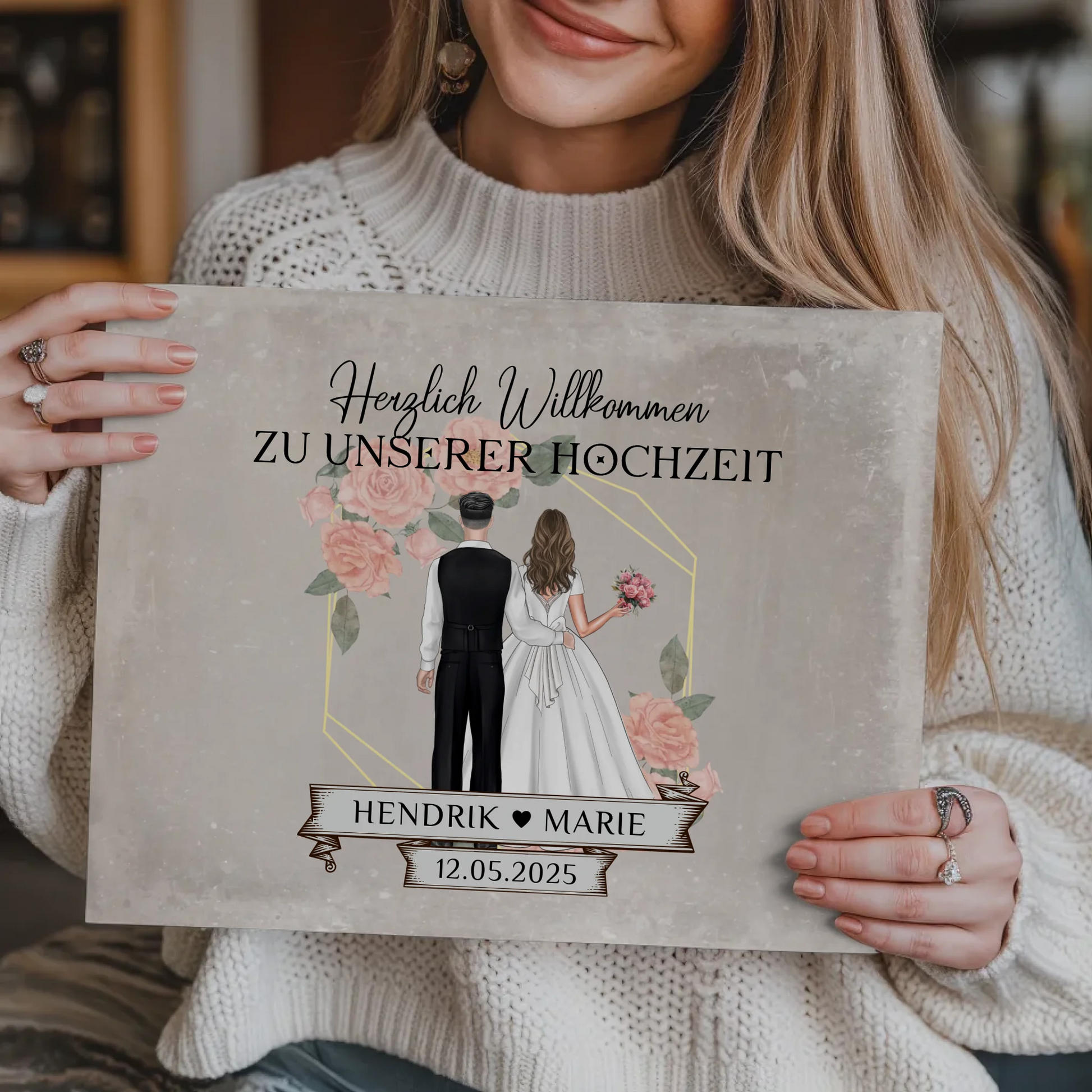 Kreiere dein eigenes Willkommensschild gestalten, indem du einfach die gewünschten Details wie Namen, Datum und Hintergrundbild angibst. So entsteht ein einzigartiges Kunstwerk, das eure Liebe und euren Stil perfekt widerspiegelt.