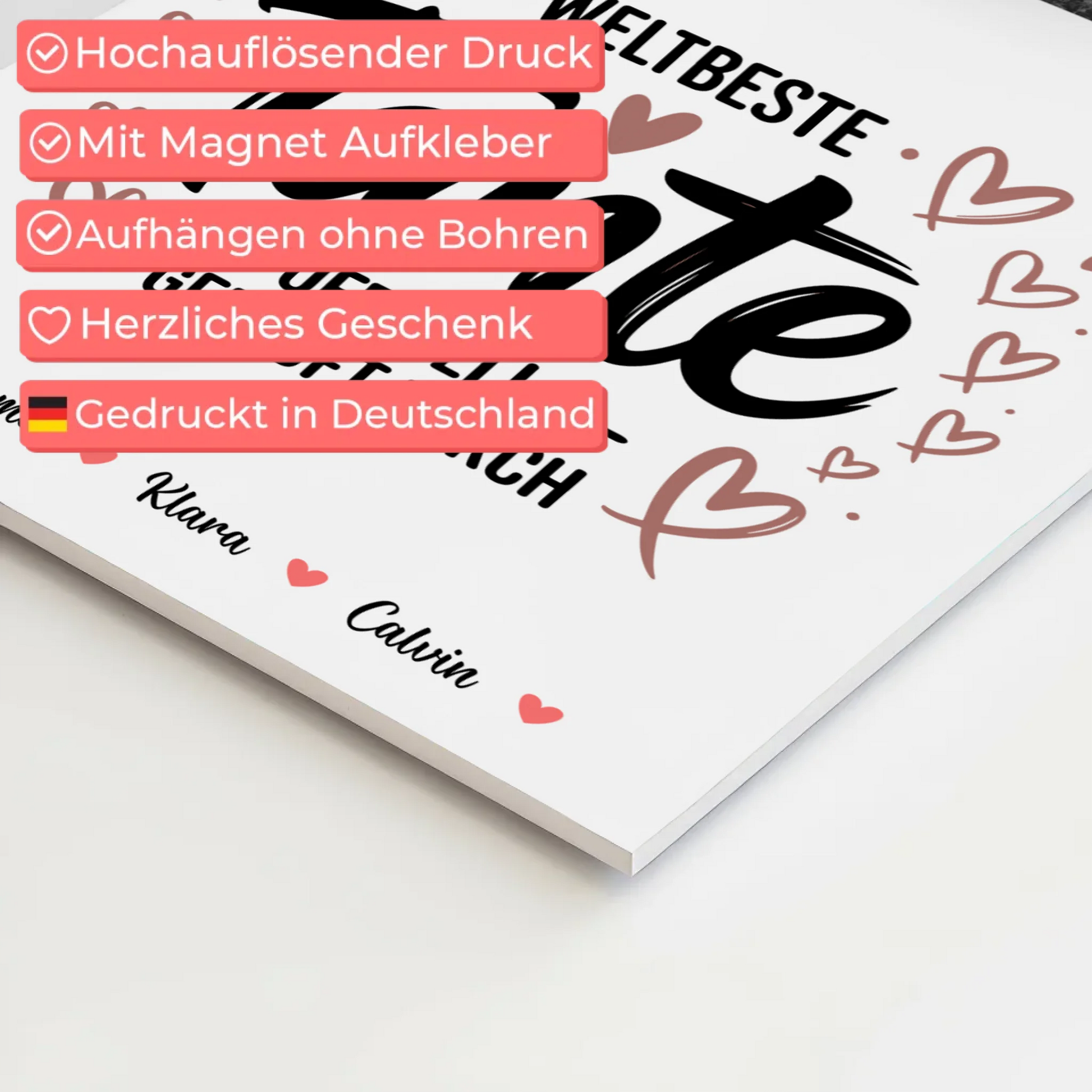 Überrasche deine liebste Tante mit einem einzigartigen Geschenk, das ihre Bedeutung in deinem Leben perfekt widerspiegelt. Das Fotoboard Magnet Poster Fotocollage für Tante ist die ideale Wahl, um deine Wertschätzung auf kreative und persönliche Weise zu zeigen. Dieses individuell gestaltbare Geschenk kannst du ganz nach deinem Geschmack anpassen: Wähle bis zu 3 Fotos, füge die Namen deiner Tante sowie ein passendes Hintergrundbild hinzu. Ob farbige Fotos oder Schwarz-Weiß-Filter - du hast die freie Wahl, um das Design perfekt auf deine Tante abzustimmen. Das Design besticht durch eine stilvolle Fotocollage mit 3 Fotos, die du mit verschiedenen Hintergründen wie weiß, floralen Mustern, Wasserfarben-Style, Holz-Optik oder mit Mustern wie Sternen oder Blüten personalisieren kannst. Der Spruch „Weltbeste Tante Offiziell Geprüft Durch macht dieses Fotoboard zu einem besonderen Highlight. Das Design ist modern und liebevoll gestaltet, um deiner Tante eine Freude zu bereiten. Dieses personalisierte Geschenk eignet sich für jeden Anlass - sei es Geburtstag, Weihnachten, Jubiläum oder einfach nur so, um deiner Tante zu zeigen, wie sehr du sie schätzt. Das Fotocollage für Tante ist perfekt für alle, die ihrer liebsten Tante eine persönliche und kreative Überraschung bereiten möchten. Überrasche deine Tante mit diesem einzigartigen Geschenk, das garantiert für Freude sorgt!