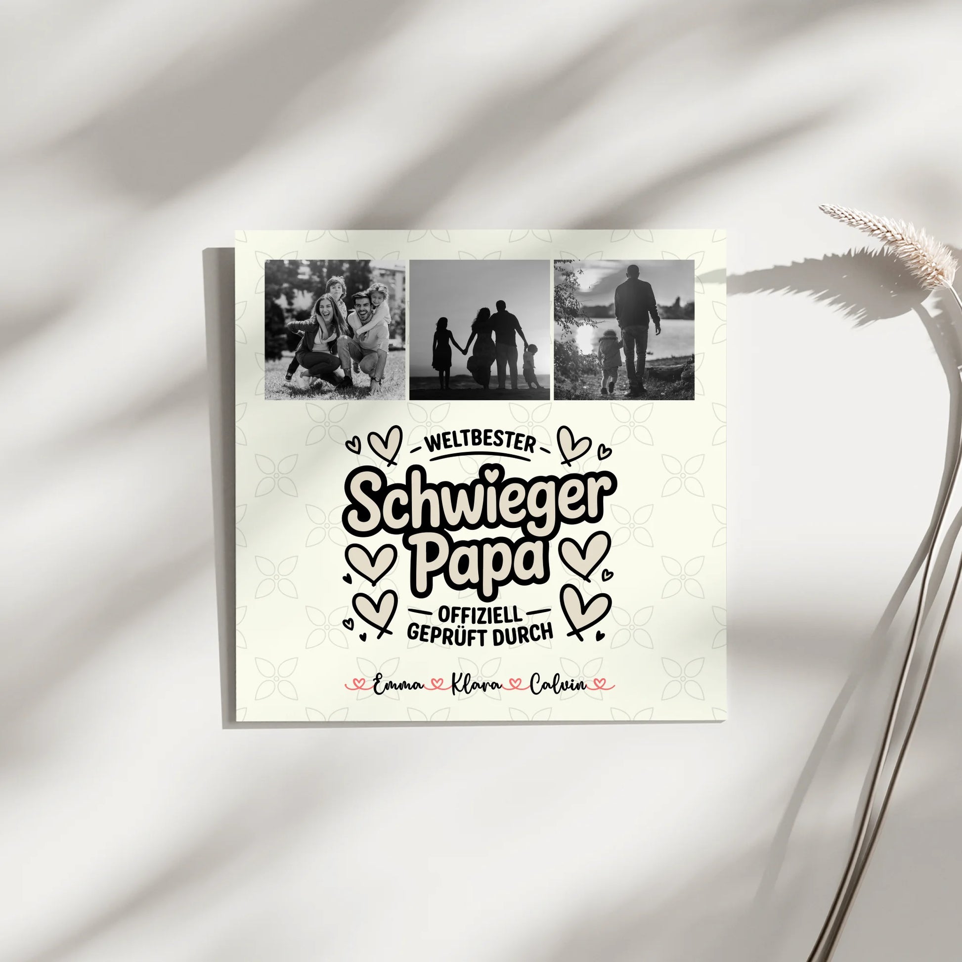 Gestalte das Fotoboard ganz nach deinen Wünschen: Lade drei deiner schönsten Fotos hoch und halte gemeinsame Momente für immer fest. Die Fotos kannst du farbig lassen oder mit einem stilvollen Schwarz-Weiß-Filter versehen - ganz wie es dir gefällt! Wähle außerdem den Hintergrund, der am besten zu deinem Schwiegerpapa passt: Ob klassisch weiß, mit floralen Elementen, im angesagten Wasserfarb-Style, rustikalem Holz-Look oder mit fröhlichen Mustern wie Sternen oder Blüten - hier ist für jeden Geschmack etwas dabei. Zusätzlich kannst du die Namen der „Prüfer eintragen, die deinem Schwiegerpapa offiziell den Titel „Weltbester Schwiegerpapa verleihen.