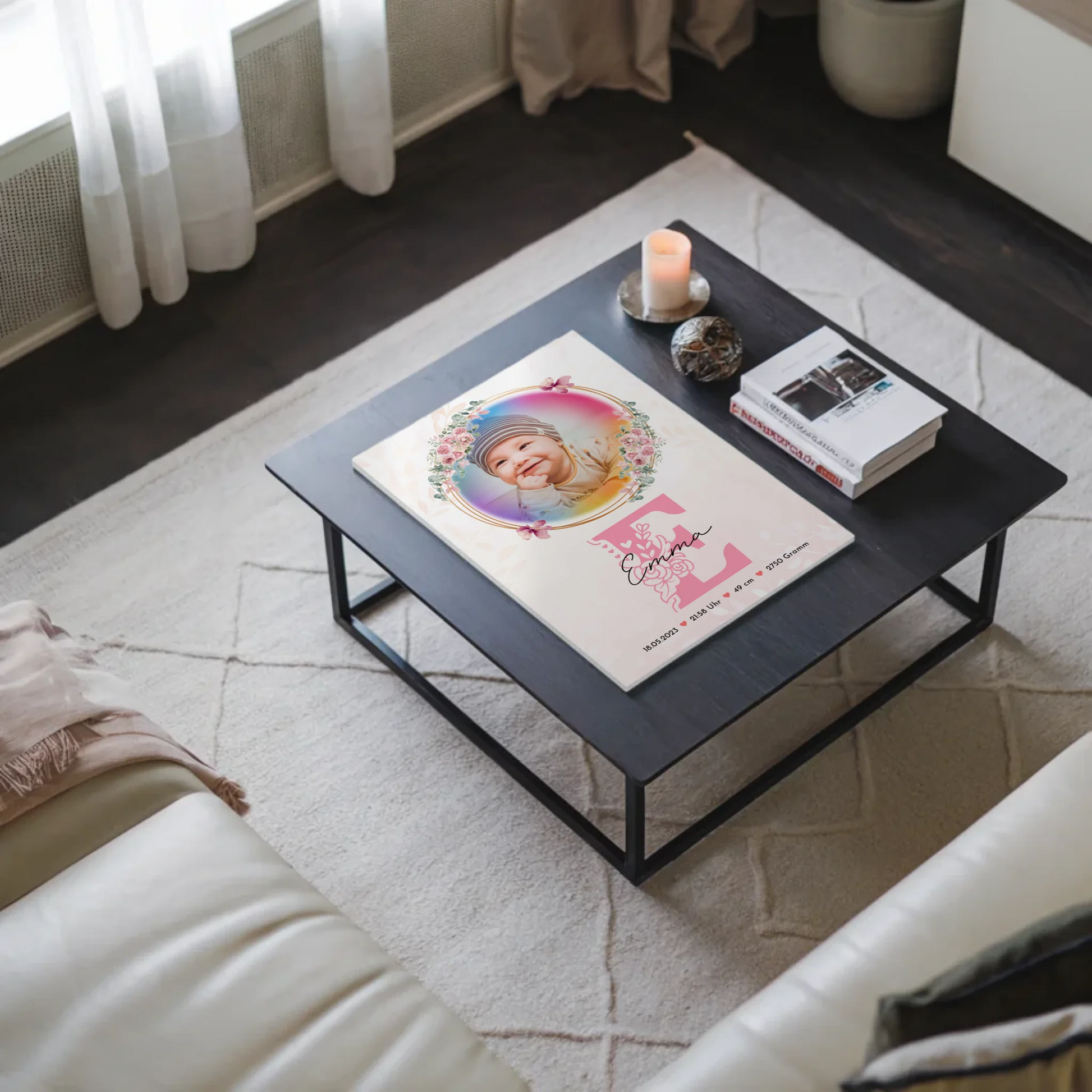 Du kannst folgende Angaben anpassen: Geburtsdaten wie Gewicht, Groesse, Uhrzeit und Datum; ein Foto; Initial Buchstabe & Name. So entsteht ein individuelles Erinnerungsstueck, das genau die Geschichte des neugeborenen Babys erzählt.