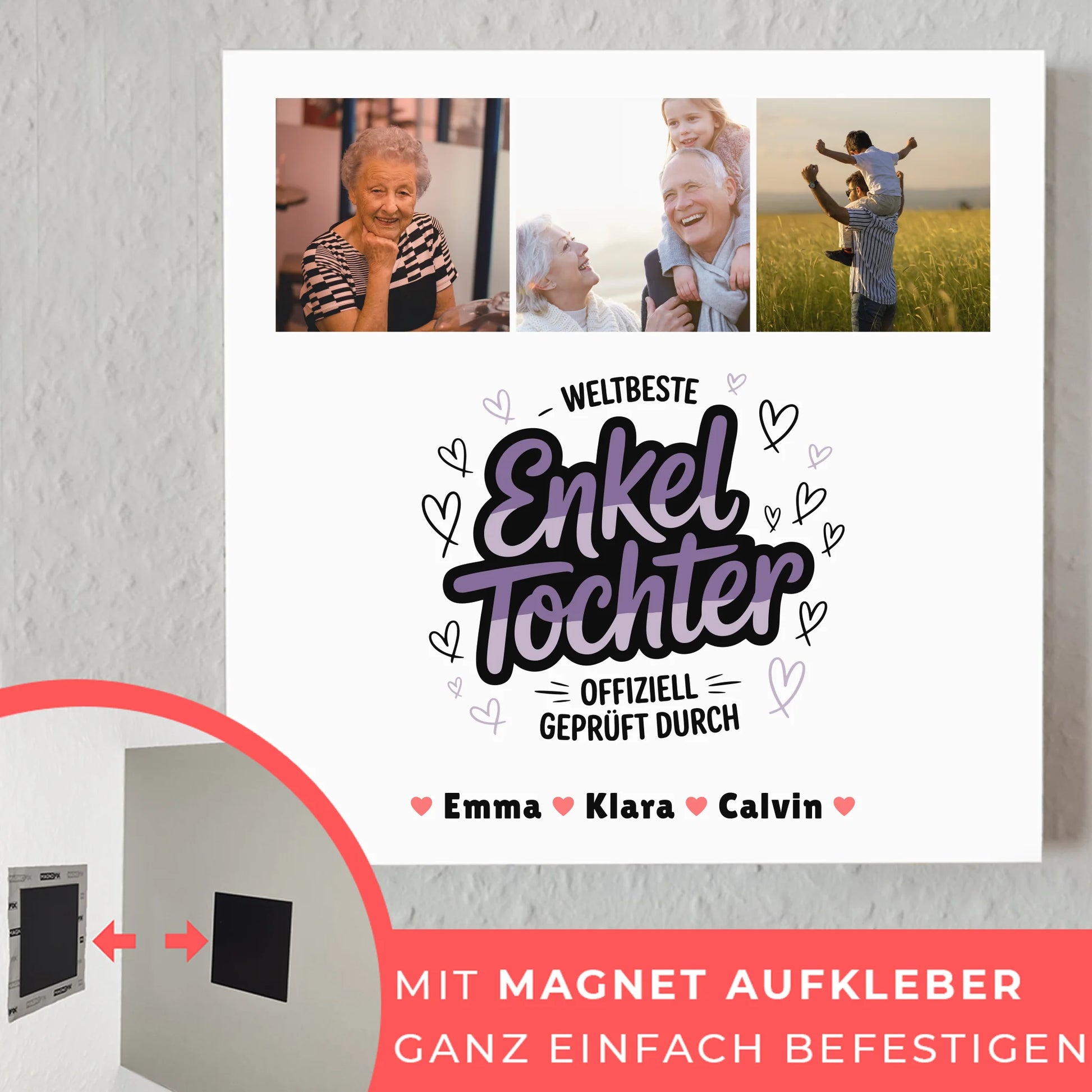Überrasche deine Enkeltochter mit einem einzigartigen und persönlichen Geschenk, das sie garantiert begeistern wird. Das Fotoboard Magnet Poster Geschenk für Enkeltochter - Weltbeste Enkeltochter Offiziell Geprüft Durch ist die perfekte Wahl, um deine Liebe und Wertschätzung auf kreative Weise zu zeigen. Dieses individuell gestaltbare Poster kannst du ganz nach deinem Geschmack personalisieren: Füge 3 Fotos, den Namen deiner Enkeltochter sowie ein passendes Hintergrundbild hinzu. Ob für Geburtstage, Weihnachten, Jubiläen oder einfach als kleine Aufmerksamkeit - dieses Geschenk ist für jeden Anlass geeignet.